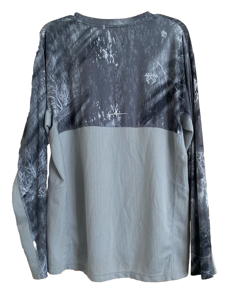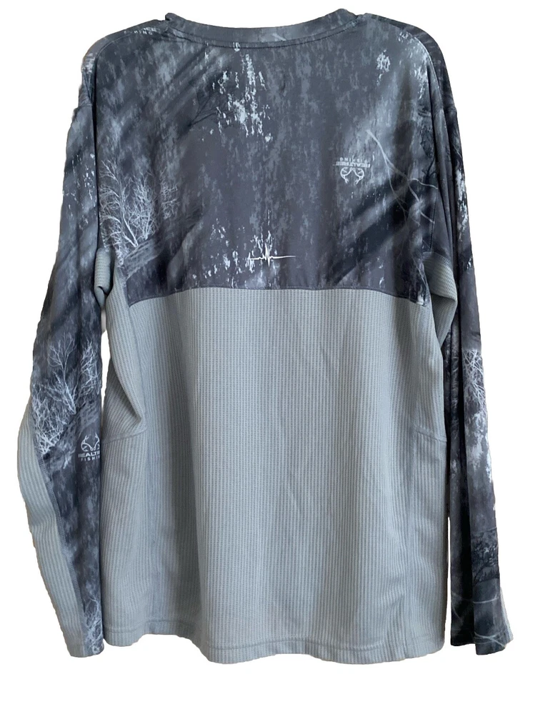 This Realtree Fishing Habit men's long sleeve shirt is perfect for any fishing enthusiast. The shirt features a camouflage pattern with a crew neck color gray/white. It is made of lightweight and breathable polyester knit fabric, which makes it suitable for all seasons. The shirt is machine washable and has easy care, double-sided, and moisture-wicking features. It comes in a gray color with a graphic print of a fish and is available in size L.
