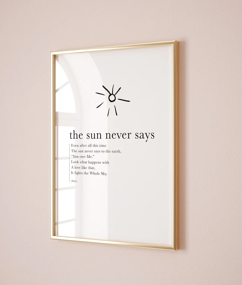 Hafiz Quote The Sun Never Says Hafiz Print Minimalist Wall Art Inspirational Quote Motivational Quotes Art Print Material: Premium luster photo paper Print type: Inkjet printing One side printed + The finish provides the highest possible resolution and color saturation + Lasts up to 200 years in color and 400 years in black-and-white + Printed on high-quality resin-coated photo base paper medium + Posters can be hung with double-sided tape, tacks, or framed + Hand washing with a gentle cry cloth is recommended for extended durability I will hand select the best choice of paper for your chosen design to ensure top quality results for a beautiful, bright and luxurious print. All prints are sealed in cellophane slips for protection during transportation, and are shipped in a protective cardboard envelope.