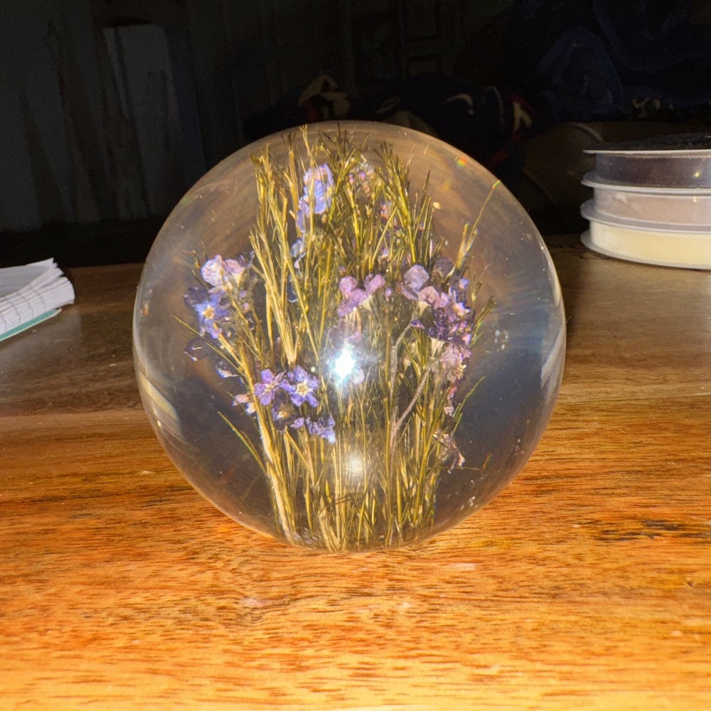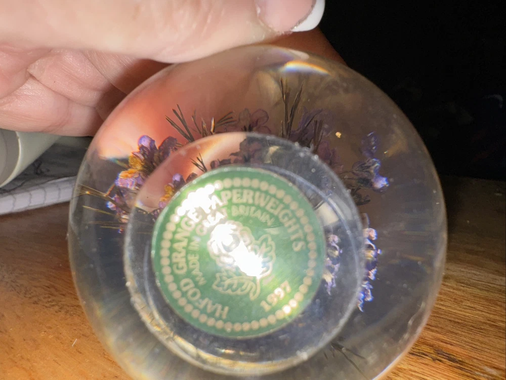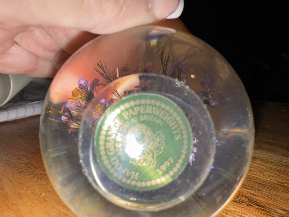 The Hafod Grange Lucite Paperweight features a beautiful design of pink flowers and heather, symbolizing the beauty of Great Britain. Made from lucite, this vintage piece adds a touch of elegance to any collection or decor. With its origins from the United Kingdom, this paperweight is a unique and charming addition to any space.
