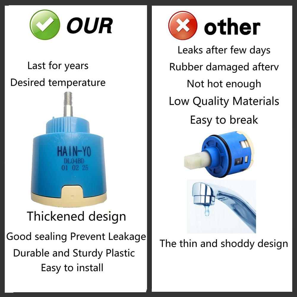 Hain-Yo DL04BD 40mm Joystick Single Lever Faucet Cartridge,Great Addition to Faucet Repair Kit,Replacement Cartridges for Indoor and Outdoor Faucet Handle FAUCET SPECIFICATIONS: Hain-Yo DL04BD faucet replacement cartridge measures 40mm diameter - 1 9/16" diameter, O ring size of 6mm x 1mm, middle stop, H= 2-13-32", and CC=15/16". This replacement part is for single handle joystick faucets in the kitchen, bathroom, shower, and outdoor faucet. Easy to install and use strong materials, durable. if you have any questions during the installation or use process, please contact us in time KITCHEN AND BATHROOM CARTRIDGE REPLACEMENT: Fits kitchen and lavatory faucets that use 40 mm motion cartridges Hain-Yo DL04BD 40mm Joystick Single Lever Faucet Cartridge,Great Addition to Faucet Repair Kit,Replacement Cartridges for Indoor and Outdoor Faucet Handle VERSATILE DESIGN: This is a single lever cartridge whose design, make, and features can deliver satisfaction to users. You can use it for multiple shower bodies. It is a versatile faucet cartridge that also fits and replaces old bathroom and bathtub taps. Install it properly to use faucets with smooth flowing water once again.