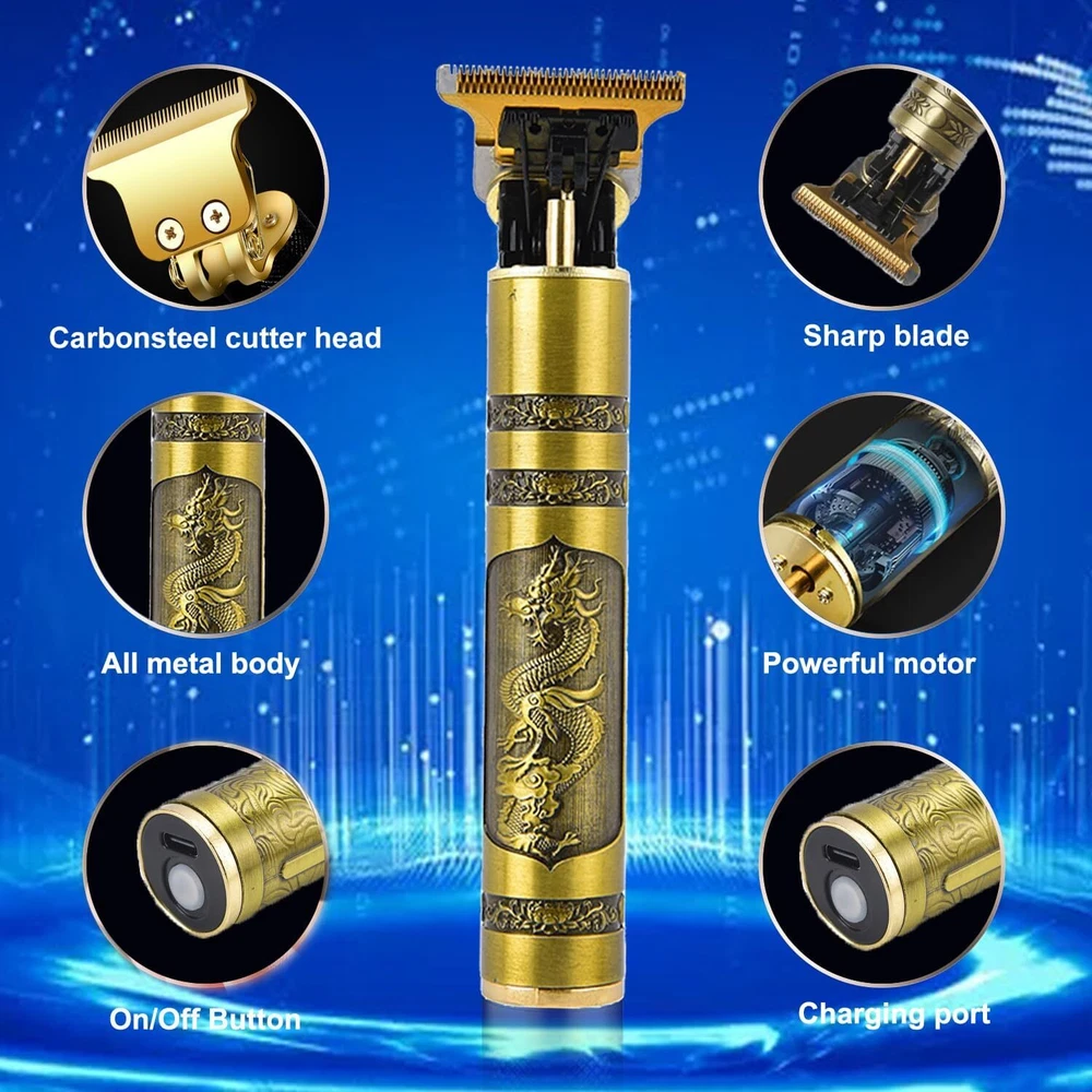 T BLADE TRIMMER: Professional hair clipper for men is equipped with a sharp blade that can easy to trim hair, beard, sideburns, face, and body hair. The R-shaped obtuse edge design ensures the safety and comfort of the haircut. Great for beginners or professional hairdressers. USB CHARGING SUPPORT: The T blade hair trimmer for men with equipped with rechargeable battery that provide over 180 minutes of run time after 2.5 hours full charged. The USB charging port allows you to connect USB devices such as USB adapters, laptops, car chargers, mobile power adapters, etc. The cordless design is convenient for families and travel. POWERFUL MOTOR & LOW NOISE: The beard trimmer with a powerful rotary motor, smooth and does not get stuck in the hair. Stronger power and less noise. Noise is less than 60 decibels. The cutter head can be washed directly with water. Note: Please do not let water into the body. WIDE APPLICATION: The zero gapped trimmer has four different lengths of guide combs (1.5mm / 2mm / 3mm / 4mm), you can use it according to the length of hair you want. Suit for hair trimmer, beard trimmer, shavers, edgers clippers, and so on. It's widely used for men women or elderly. GREAT GIFT: The hair clipper with lightweight and stylish design, is comfortable to hold. one-button ON/OFF, easy to use. Hair clippers are the best gifts for men, husband, friends and father on Christmas, Birthdays, Valentine's Day, and Father's Day. Product Description ZERO GAPPED TRIMMER HAIR CLIPPER Men hair trimmer is suitable for oil head, carving, vintage hairstyle and other hair design, a perfect gift for your family and friends. Professional Electric Hair Clippers Cordless and convenience. T-blade design: easy to trim hair, beard, sideburns, face, and body hair. Zero Gap: ensures the safety and comfort of the haircut. Easy to clean: Easy to keep clean and avoid bacteria buildup. Ergonomic Design: Comfortable grip, not easy to slide. Characteristics: Color: Metallic-Black, Dragon-Gold Charging: Type-C USB 2 hours of charging, 2 hours of use Packaging 1 * Hair Trimmer 4 * Limit Comb 1 * USB Cable 1 * Cleaning Brush 1 * Operating Instructions Self-Sharpening Precision Blades The sharp stainless steel precision blades, easy to trim hair, beard, sideburns, face, and body hair. Strong Power & Low Noise Power motor delivers efficient cutting speed, reducing friction, achieves quick, and precise clipping. Stronger power and less noise. Easy To Clean The cutter head can be washed directly with water. Note: Please do not let water into the body.