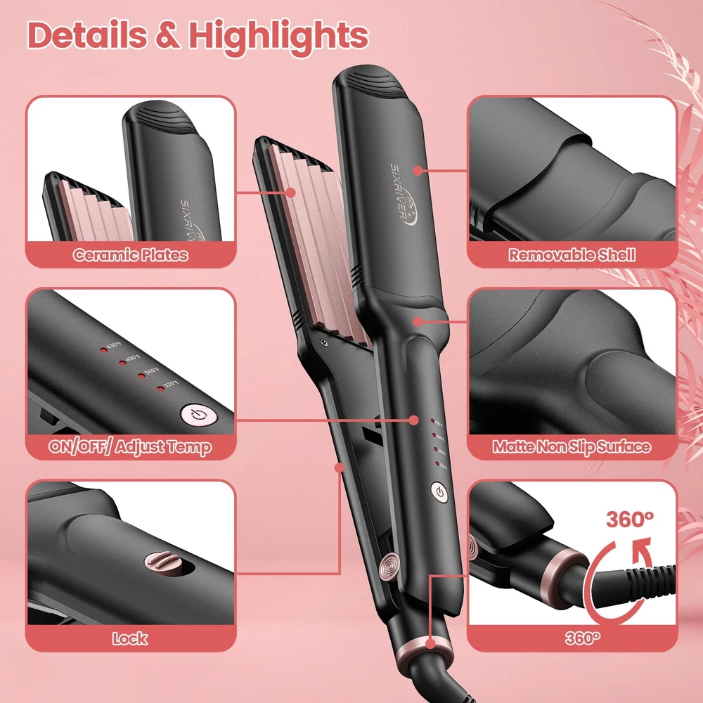 Your ultimate hair styling tool that can do it all! Whether you're looking to achieve straight locks or beachy waves, this hair straightener can help you transform your hair with ease. The ceramic plates of this flat iron straightener offer even heat distribution, ensuring that your hair stays smooth and damage-free. With 4 temperature settings, you can customize the heat to your hair's needs. The dual voltage makes it perfect for travel, allowing you to take your hot tools with you wherever you go. Not only can this hair waver make your hair straight, but it can also crimp the root of your hair for added volume and texture. To take it up a notch, pair it with our volumizing hair clips and create the look you've always wanted. This flat iron hair crimper is especially great for black women's hair and anyone looking for some extra volume. If you're short on time, use the bedhead waver iron to create quick and easy beach waves or use the hair crimper for women for an edgy texture that completes your outfit. ππͺππππππ π―ππππππ π·ππππ & 4 π»ππππππππππ πͺπππππποΌThe hair crimper with the latest ceramic heating plate helps to reduce frizz and add a lot of shine. Double-sided lacquered design to avoid scratching fingers when replacing plates. 320/360/390/430/430Β°F (160/180/200/220Β°C), four different temperature levels for all hair types such as short/long/thin/thick/soft/hard and coarse hair. π€³π½ππππππ π―ππππππππποΌIncluding three different sizes of deep waving plates and one straight plate, Sixriver hot tools flat iron, as a Christmas gift, can fully meet the needs of different hairstyles. You can easily switch between straight and curly hair with the crimper hair tool in your daily life, as well as tousle your roots. 80's fashion is making a comeback, and curly hair is definitely here to stay! ππ¨πππ-ππππππ π«ππππποΌReplacement plates of volumizing hair clips are infused with keratin and argan oil for moisturizing and nourishing properties that deliver shiny, less damaging styling results. Electric ceramic emits millions of negative ions to smooth cracked hair cuticles and lock in the hair's own natural oils and moisture. βοΈπ«πππ π½ππππππ π«ππππποΌProfessional special waver hair tool with dual voltage design (100-240V), you can take the iron to Asia, Europe, North America or anywhere (in some cases you need to equip with an adapter). 360Β° swivel cord design prevents hair from tangling. ποΈπ·ππππππ π°πππππ πποΌ1*hair crimp iron; 8pcs*replacement plate; 1*glove; 2*hair clips; 1*replacement plate bag. Flat iron straightener is designed with widened plates to be able to handle more hair at a time.
