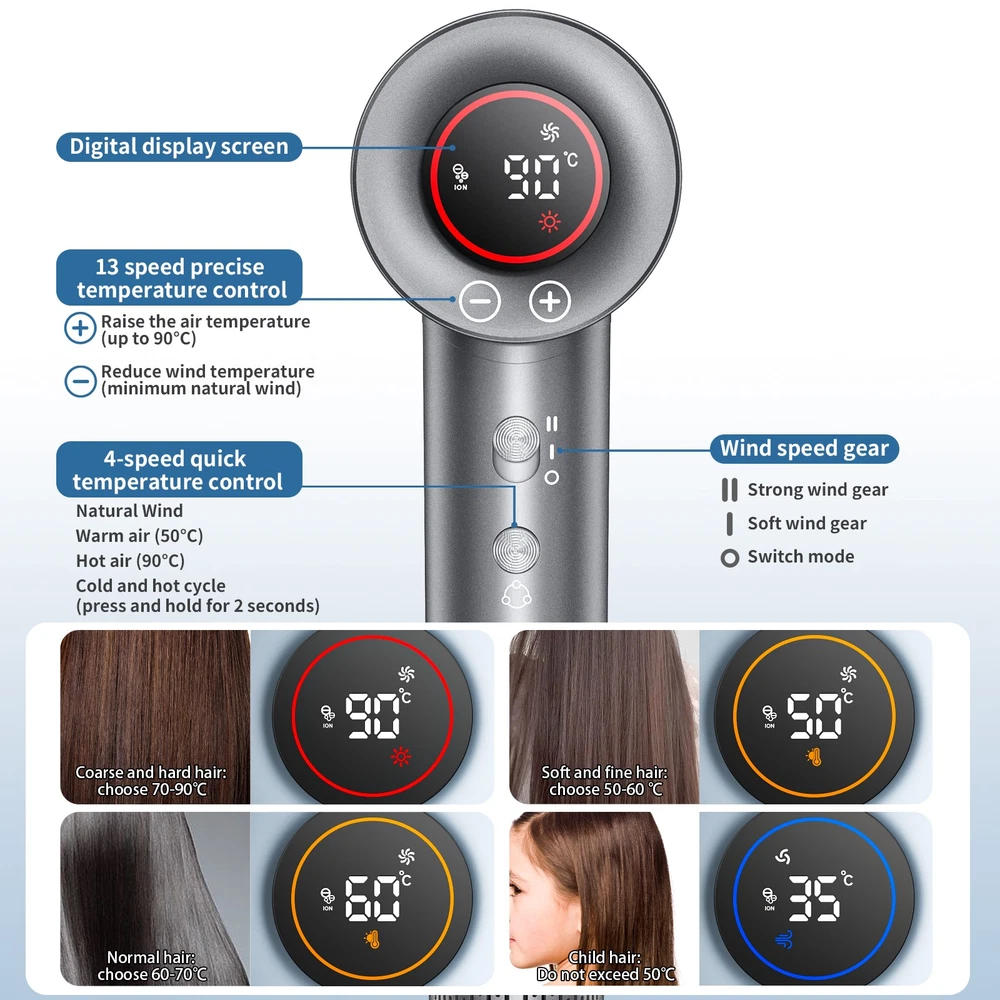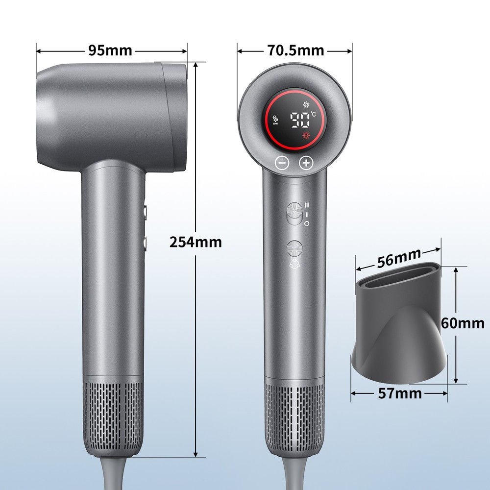 【Superior Speed & Gentle on Hair】 Experience the power of our hair dryer's high-speed brushless motor, boasting an impressive 110000 RPM. With a wind speed of 30m/s, it dries your hair 5x faster than traditional dryers, giving you more time to enjoy the results. Fast drying has never felt this awesome! 【Revolutionary Ionic Technology】Say goodbye to frizz and hello to silky-smooth hair. Our hair dryer releases an astounding 400 million negative ions, thanks to state-of-the-art ionic technology. These negative ions lock in moisture, nourish your hair, and enhance its natural shine. Feel the softness, fluffiness, and effortless style. 【Low Noise, Maximum Enjoyment】We understand the importance of a peaceful styling experience. The hair dryer incorporates 8 layers of advanced noise reduction technology, achieving a noise level <60dB. Say goodbye to annoyingly loud hair dryers and hello to maximum enjoyment. 【Sleek, Lightweight, and Portable】The hair dryer is designed with elegance and practicality in mind. it's remarkably lightweight and portable. The ergonomic design ensures a comfortable grip, and the simple button controls make operation a breeze. This hairdryer comes with two magnetic nozzles that rotate 360° and adapt to different hair lengths and types.Whether at home or on the go, it's your ideal companion.
