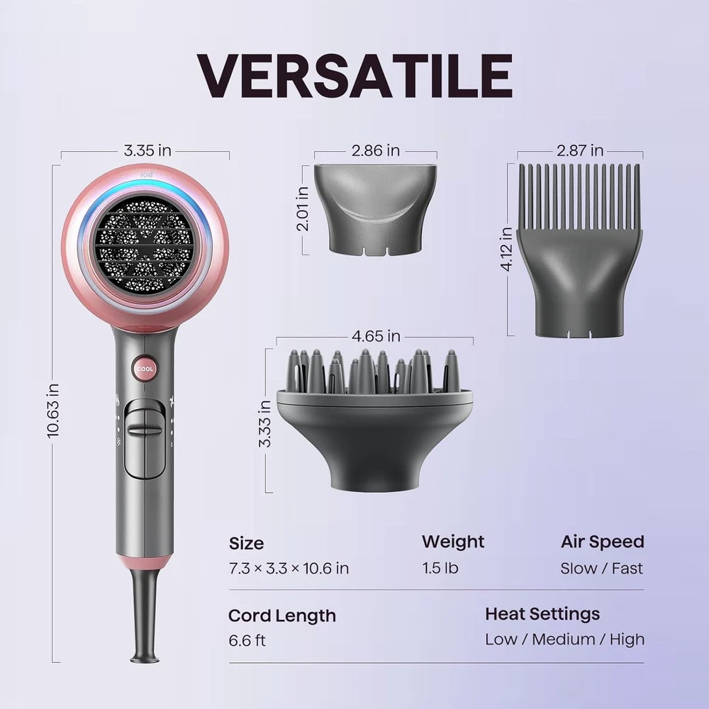 2x Faster Drying: Powered by a robust 1875W motor and advanced aerodynamic design, this ionic hair dryer delivers high-speed airflow to dry your hair twice as fast. Spend less time drying, avoid overheating, and minimize damage—all while achieving effortlessly sleek results. Ionic Frizz Reduction: This hair dryer releases millions of negative ions during use, neutralizing static, taming frizz, and boosting shine—leaving your hair smooth, glossy, and effortlessly polished. 3 Attachments for Every Style: A concentrated nozzle delivers precision airflow, allowing for targeted styling and greater control. The diffuser reduces frizz while enhancing and defining natural curls or waves. The comb attachment smooths and straightens, making it perfect for managing thick, unruly hair with ease. 3 Temperature Settings: With three temperature settings and two airflow speeds (including a cool air option), this device offers customizable versatility for every hair type, turning your daily hair care routine into an effortless, salon-worthy experience. Safety Protection & Low Radiation: Equipped with an automatic shutdown function to prevent overheating, this hair dryer with diffuser ensures safe use at all times. Additionally, its low electromagnetic wave technology reduces radiation by 50%, making it a safer choice for pregnant women and children.