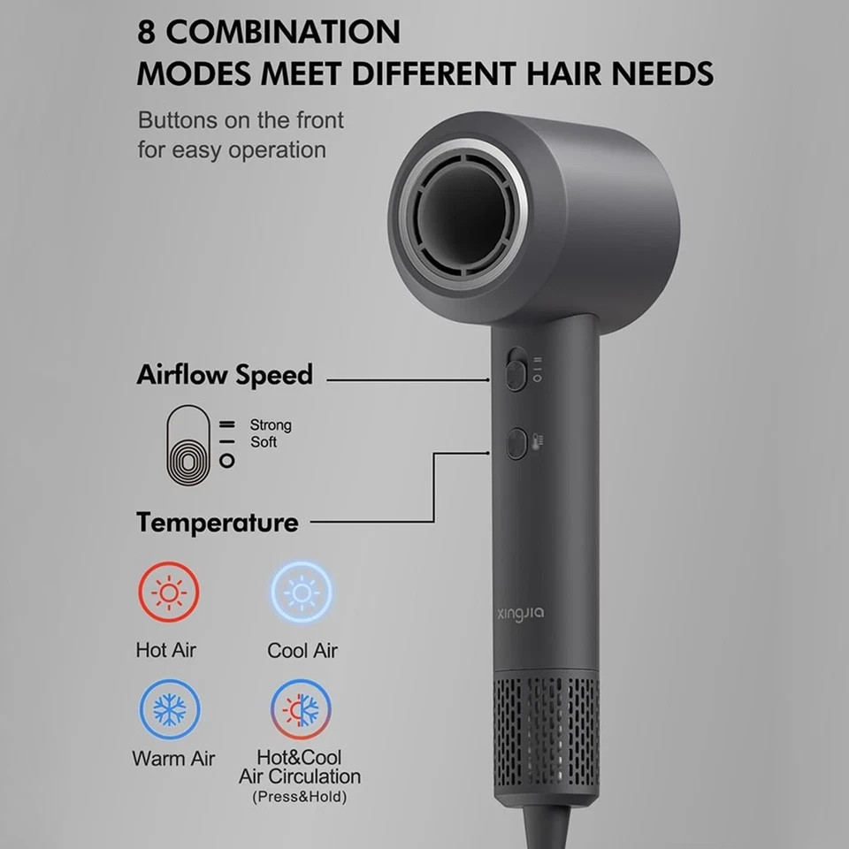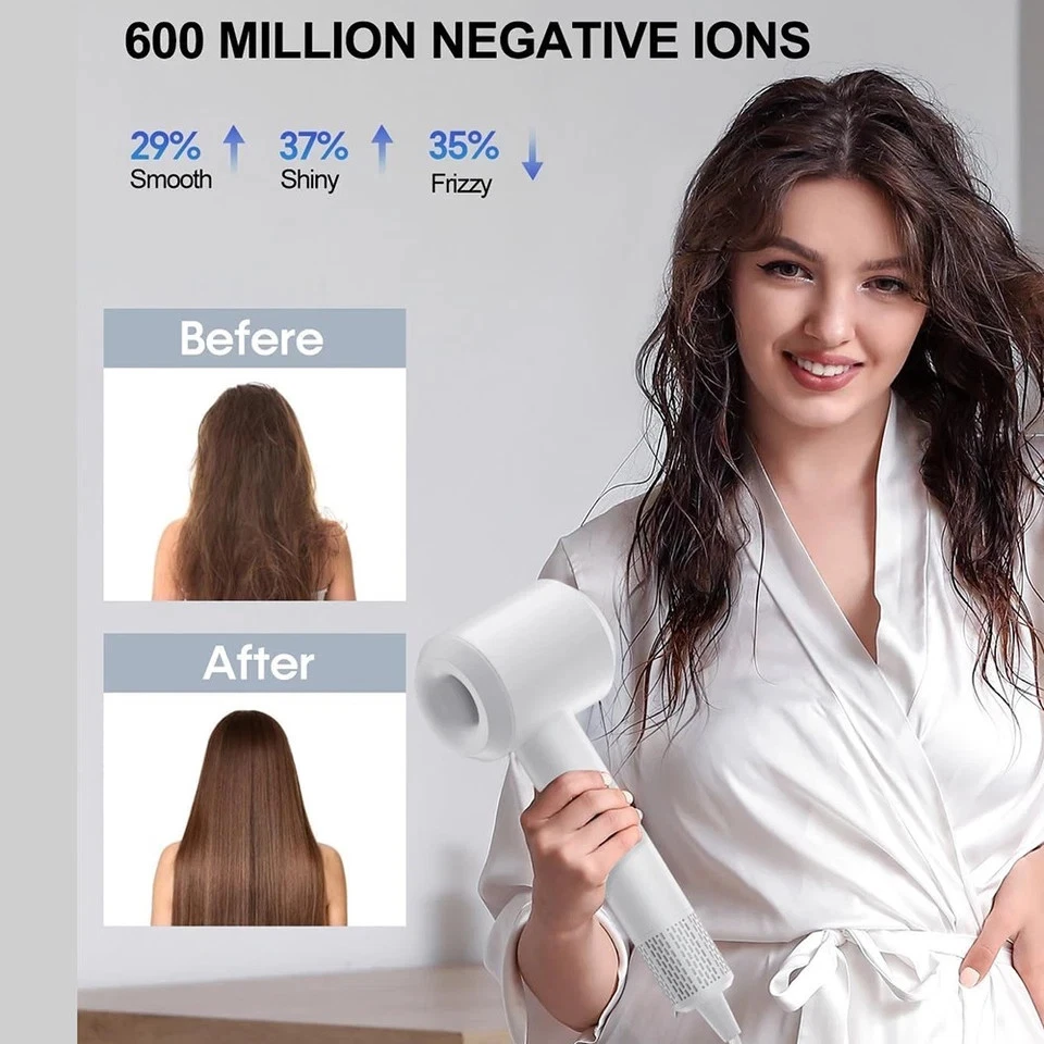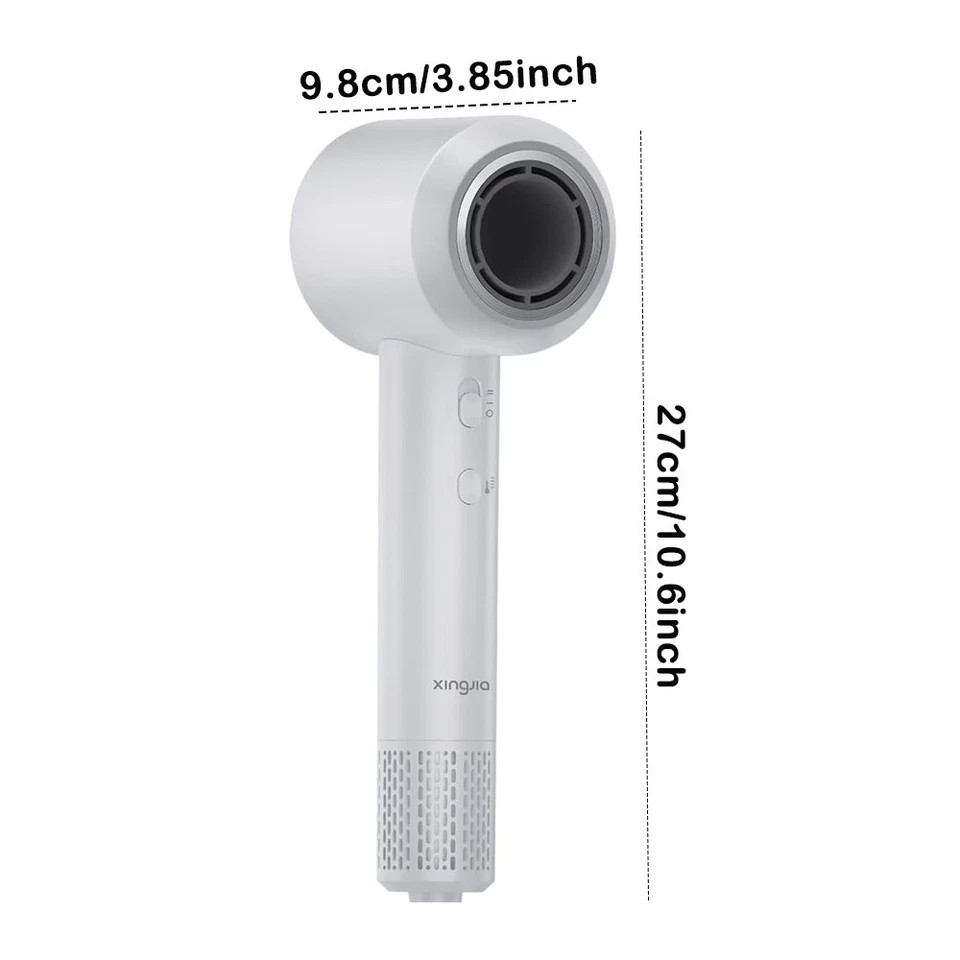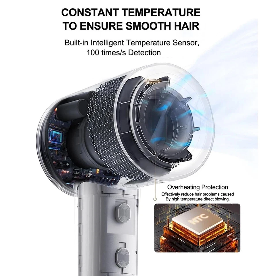 Fast-Dry High-Speed Hair Dryer: 110,000 RPM brushless motor for strong airflow and quick drying in 2–8 minutes. Anti-Static Ionic Technology: Releases 200 million negative ions to reduce frizz and leave hair smooth and shiny. Smart Heat Control: Prevents heat damage with automatic temperature regulation. LED lights show heat mode: red (hot), yellow (warm), blue (cool). Safe & Reliable: FCC certified with overheat, over-current, and over-voltage protection. Magnetic nozzle and anti-hair-suction filter. Lightweight & Travel-Friendly: Only 0.9 lbs. Perfect for home, travel, and as a Christmas gift.