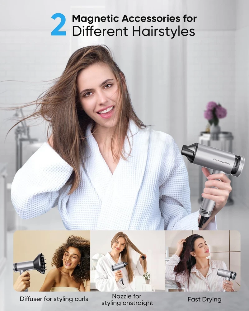Hair Dryer with Diffuser, High-Speed 150000 RPM for Fast Drying, Lightweight, One-Touch Cool Air Button, 500 Million Negative Ionic Blow Dryer with Magnetic Nozzle, HD Display Fast Drying: The hairdryer features a high-speed 150000 RPM brushless motor with wind speeds up to 36m/s, powerful airflow makes it possible to dry hair in less than 4-7 minutes. It dries hair 5 times faster than any traditional hair dryer while also caring for your hair Revolutionary Ionic Technology: This diffuser hair dryer releases 500 million negative ions per second to nourish and care for the hair, reduce frizz, and provide a comfortable experience for clients Versatile Temperature Control: Our hairdryers offer 3 temperature settings. The one key cold air button can quickly switch between cold or hot air, suits all hairstyles. The HD display simplifies adjustments for a comfortable experience. The hair dryer has an overheating protection device, overheating will automatically stop running No Heat Damage: The blow dryer with diffuser is equipped with an NTC Smart Temperature Control Sensor that monitors air temperature over 500 times per second, effectively preventing hair from overheating damage Lightweight: This ionic hair dryer has made a revolutionary and innovative design in terms of body compared to other hair dryers, unlike the previous heavy body, it weighs only 0.74lbs.Its lightweight design minimizes arm fatigue and still provides a comfortable experience even after long hours of use Please note: Please read our user manual carefully before use. WARNING: DO NOT place or store appliance where it can fall or be pulled into a tub or sink, and do not place in or drop into water or other liquid