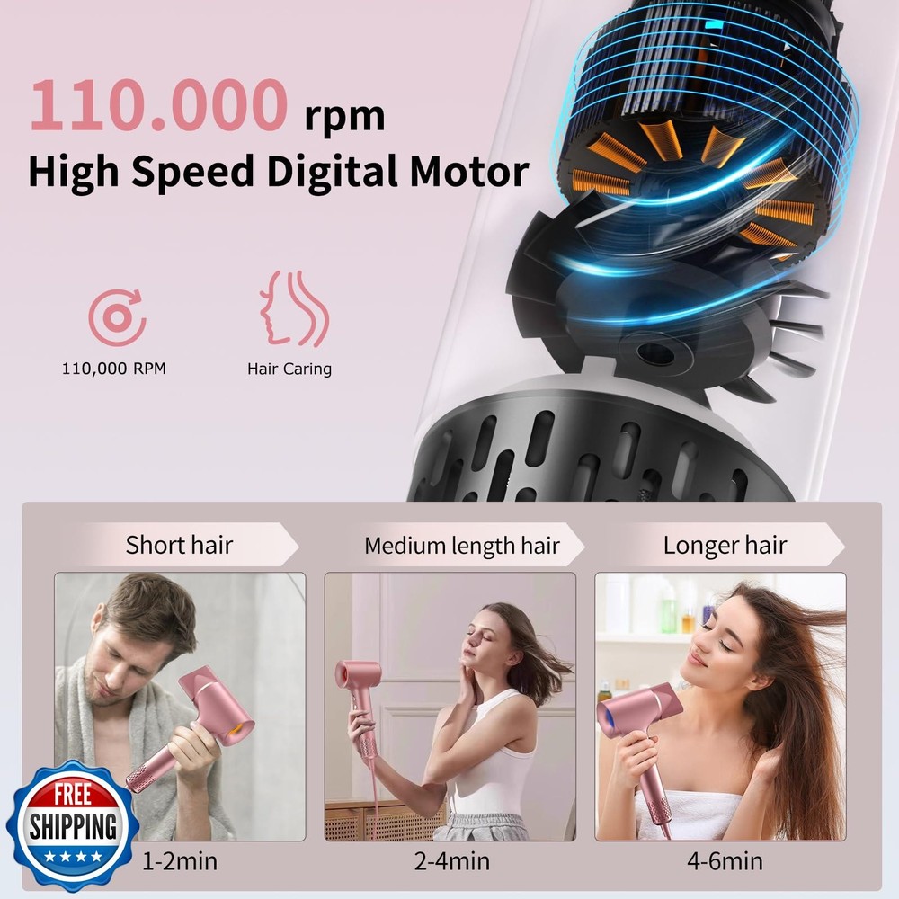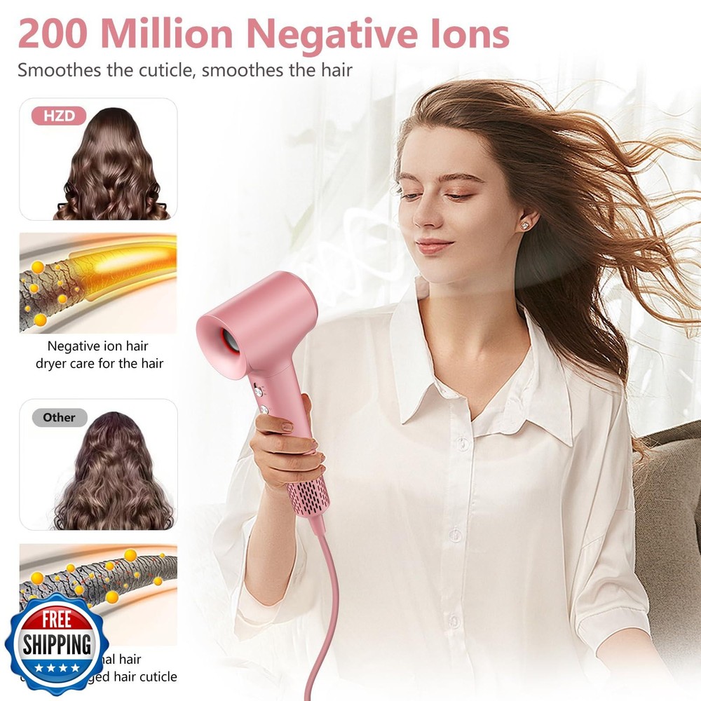 Hair Dryer, Ionic Blow Dryer, 1500W High-Speed Hairdryer with 110000 RPM Brushless Motor for Fast Drying Low Noise, 4 Temps and 2 Speeds with Magnetic Nozzle Features High Speed Hair Dryer:Equipped with a 110,000 RPM high-speed brushless motor that delivers wind speeds of up to 22 meters per second, this hair dryer dries hair in just 2-5 minutes - five times faster than traditional hair dryers - ensuring efficient drying, frizz reduction, and shine enhancement, so you can enjoy the comfort of a professional salon in the comfort of your own home. Protects Hair and Improves Hair Quality:Intelligent thermal control system technology of the hairdryer keeps the temperature at 52 °C by alternating hot and cold airflow. It monitors the air temperature 100 times per second and regularly makes small adjustments to prevent your hair and scalp from being damaged by extreme heat. Negative Ion Hair Dryer:Hairdryer uses advanced negative ion technology, the ion generator can produce 200 million ions per cubic centimeter, neutralizing static electricity, preventing hair damage reducing static electricity, locking in moisture, leaving your hair soft and shiny and easy to care for. Low Noise and Light Weight:Our hair dryer weighs only 0.89 lb. Small, portable and ergonomically designed, it's perfect for home and travel use. Although the hair dryer has a powerful motor and wind speed, it operates at only 57 decibels. Late night hair drying won't disrupt your family's sleep. Smart Tri-color LED Ring Light Design:The three colors displayed on the circular LED ring correspond to the temperature settings of the hairdryer. Red means 78 degrees (hot air), yellow means 49 degrees (warm air), blue means cold air. Press and hold the button for two seconds to activate the intelligent circulation mode, which alternates hot and cold air every few seconds to prevent extreme heat from damaging your hair. Portable & Travel Friendly:For the gym or pool party, you can put it directly in your wet/dry bag to dry your body and clothes quickly, or you can use a blow dryer to assist in ironing your clothes when you are traveling, and then straighten the fabric by hand to achieve the ironing effect. Shipping Free & Fast Shipping: We offer free shipping to most of the USA with a normal delivery time of 3-7 days. However, due to the current situation, additional delivery time (up to 3 weeks) may be required for some items. Alternative Carriers: We may use alternative carriers (e.g., USPS, FedEx, UPS) to ensure your package arrives safely and on time. Due to the use of multiple carriers, we are unable to provide a tracking number automatically. Handling Time: Orders are processed and shipped within 1-2 business days of receiving cleared payment. Shipping Restrictions: Shipping to Alaska, Hawaii, Puerto Rico, Guam, and other US territories may incur shipping charges or delivery restrictions. Please contact us before ordering, or your order can be refunded/cancelled. State Restrictions: Certain items may not be shipped to California due to state regulations. Contact for Tracking Updates: If you require tracking updates or have any concerns about the delivery of your order, please feel free to contact us, and we will be happy to assist you. Return Policy 30-Day Hassle-Free Returns: If you are not completely satisfied with your purchase, you can return the item for free within 30 days of receiving it for a full refund or exchange. Easy Return Process: Contact us, and we will provide you with a prepaid return shipping label and detailed instructions. No Restocking Fee: There are no restocking fees for returns. However, the buyer is responsible for return shipping costs if the return is not due to a seller"s error. Refund Processing: Refunds will be processed within 1 business day of receiving the returned item in its original condition. Feedback Your feedback is extremely important to us. We strive to provide the best products and customer service possible. If you are satisfied with your purchase, please take a moment to leave us a positive review. If you have any concerns or issues with your order, please contact us before leaving negative feedback. We are committed to resolving any problems and ensuring your satisfaction. Contact Us If you have any questions or concerns, please feel free to reach out to our customer support team. You can contact us through the eBay messaging system. We are available Monday to Friday, 9:00 am to 5:00 pm EST, and we will do our best to respond to your inquiry within 24 hours. Thank you for supporting our small family business!