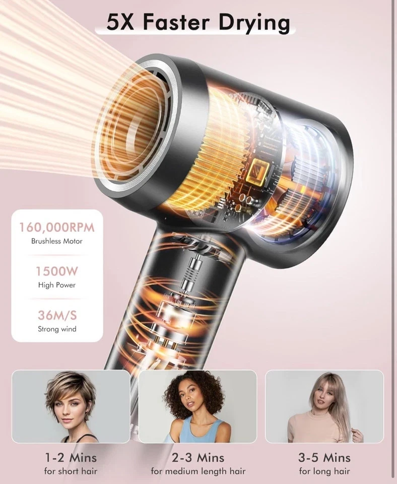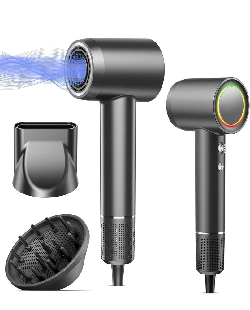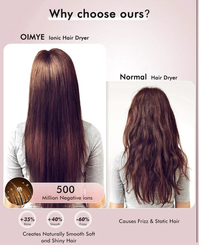 High-speed 160,000 RPM brushless motor Ultra-fast drying (1–5 minutes) Low heat + Cool air protection 500 million negative ions for smooth & frizz-free hair Intelligent heat control (110 checks/sec) Lightweight, low noise, travel-friendly Magnetic diffuser & nozzle attachments Memory mode for last-used setting USP (Unique Selling Points): 6x faster drying without heat damage Salon-quality results at home Safe for all hair types (curly, fine, thick, damaged, color-treated) ✨ OIMYE Professional High-Speed Ionic Hair Dryer Experience fast, safe, and salon-quality hair drying with the OIMYE High-Speed Ionic Hair Dryer . Powered by a 160,000 RPM brushless motor and 36 m/s airflow , it dries hair up to 6× faster than traditional dryers while protecting hair health. 💨 Low-Heat, Ultra-Fast Drying High-velocity airflow with controlled heat (max 167°F ) and a cool air setting reduces heat damage, locks in styles, and enhances natural shine. 💎 Advanced Ionic Technology Delivers 500 million negative ions to seal the cuticle, retain up to 90% moisture , reduce frizz, static, and leave hair smooth, silky, and healthy-looking. 🎛️ Smart Temperature Control & Memory Mode Intelligent system monitors temperature 110× per second with three modes—Hot, Warm, and Cool. Memory function recalls your last setting automatically. 🧲 Magnetic Styling Attachments Includes 360° magnetic diffuser and nozzle for easy styling, volume, and precision drying. 🔇 Lightweight & Quiet Design Only 0.89 lbs with advanced noise reduction ( <51 dB ), making it ideal for home, salon, and travel use.