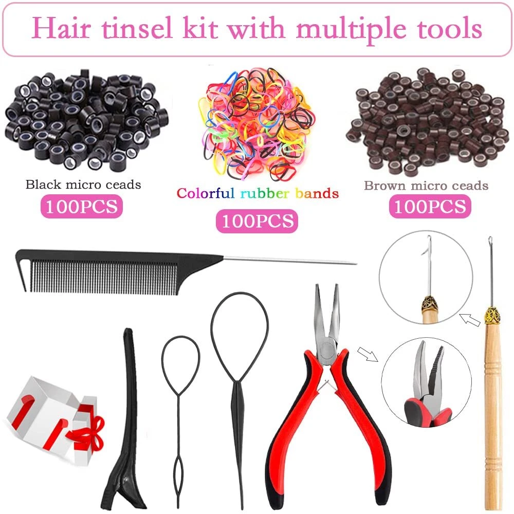 Hair Tinsel Kit with Tools: 13 Colors 3600 strands hair tinsel , 1 piece crochet, 1 piece plier, 200 pieces micro silicone link rings beads (100pcs black + 100pcs brown), 2pcs Ponytail Hoop Tools,1pc Rat Tail Comb,1piece hair clips, 1 pack of Colorful rubber bands as a gift. Definitely worth it for the money. Hair Tinsel Safe: Hair tinsel made by 100% high quality polyester fiber hair tinsel. Safe, , tasteless and will not fade. Can be washed, blow-dried, straighten, ironing,cut into different length according to your hair extension requirements. Each color tinsel is packaged separately, which is more easy to identify and use. Fairy Hiar tinsel Easy Match Your Style: The hair tinsel is the latest trend in hair fashion and the perfect hair accessory for girls of all ages.Adds amazing colors and sparkle to hair. create charming and eye-catching effect , you get tons of compliments. Tinsel Hair Extensions: The hair tinsel strands 48 Inch are long enough , cut into different length according to your hair extension requirements.13 Colors to Choose: Orange, Gold, Silver, Pink, Violet, Sky Blue, ,Champagne Gold , Rose Red, Black, Red, Blue, Green, Rainbow.a variety of colors meet the various styles of fairy hair, Release Your Charm. Service: If you have any question or problem about the Hair tinsel kit, We provide 24-hours .