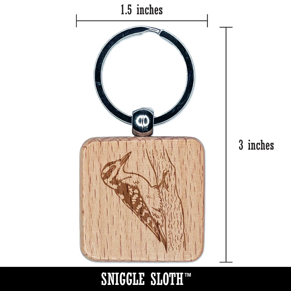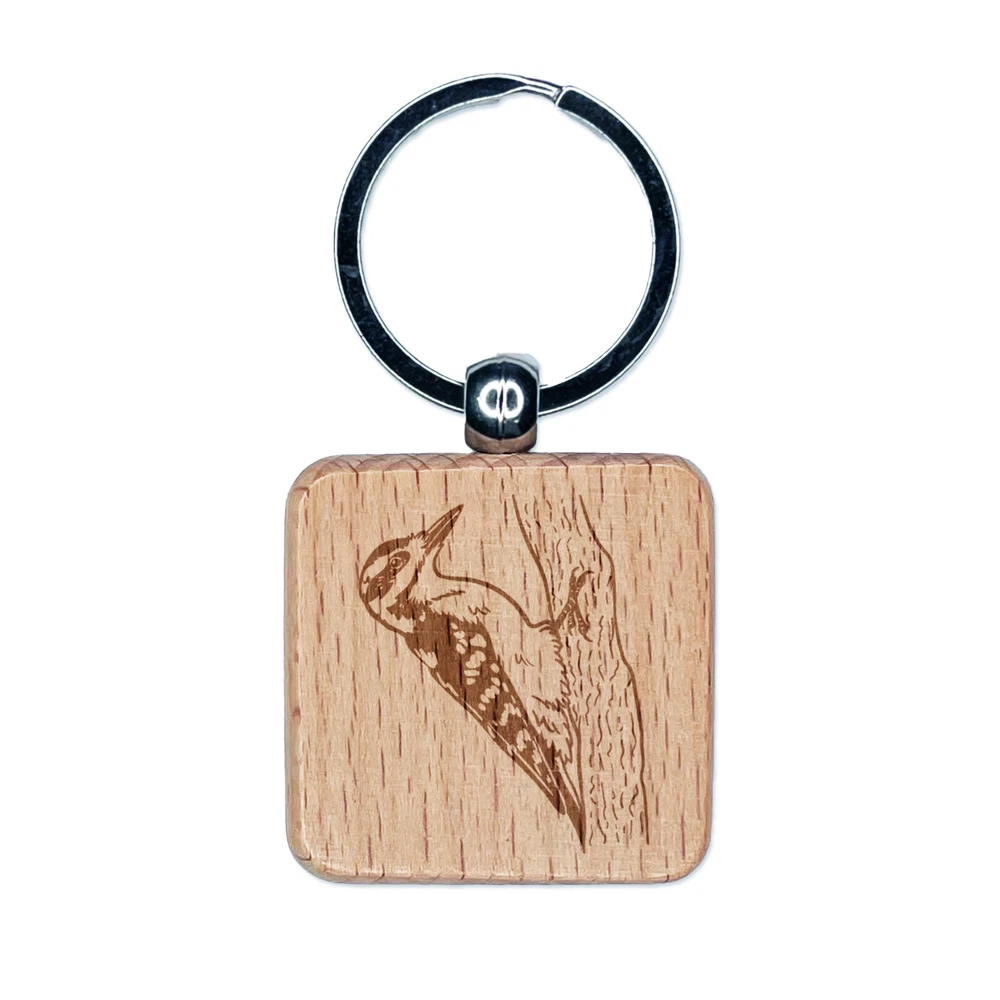 Hairy Woodpecker Bird on Tree Engraved Wood Square Keychain Tag Charm