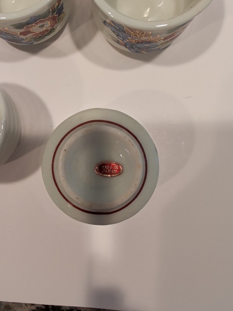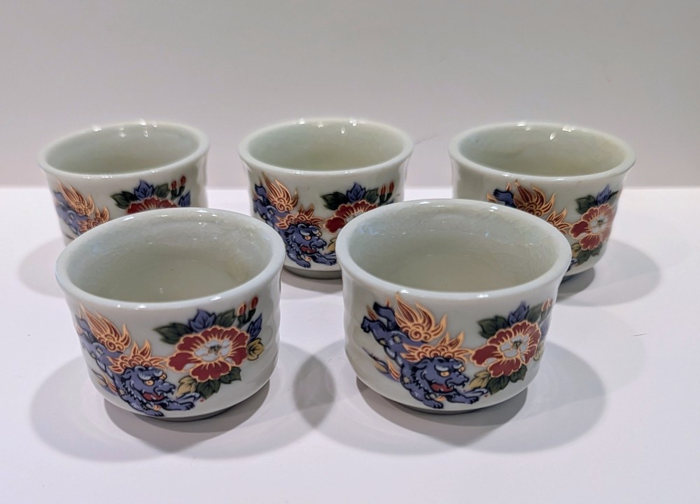 The Hakutsuru Chika Sake Cup is an empty glass cup that originates from Japan. It is a collectible item that represents Japanese culture and is a perfect addition for those interested in Asian collectibles. The cup is not handmade and carries a sense of authenticity with its Japanese heritage. Perfect for display or for adding a touch of Japanese aesthetic to any collection. There is also a set of 5 vintage ceramic Japanese sake cups. They all have a 'Made in Japan' label. There is crackling in the glass finish which may or may not be intentional. Bright colorful motif of foo dog and flowers.