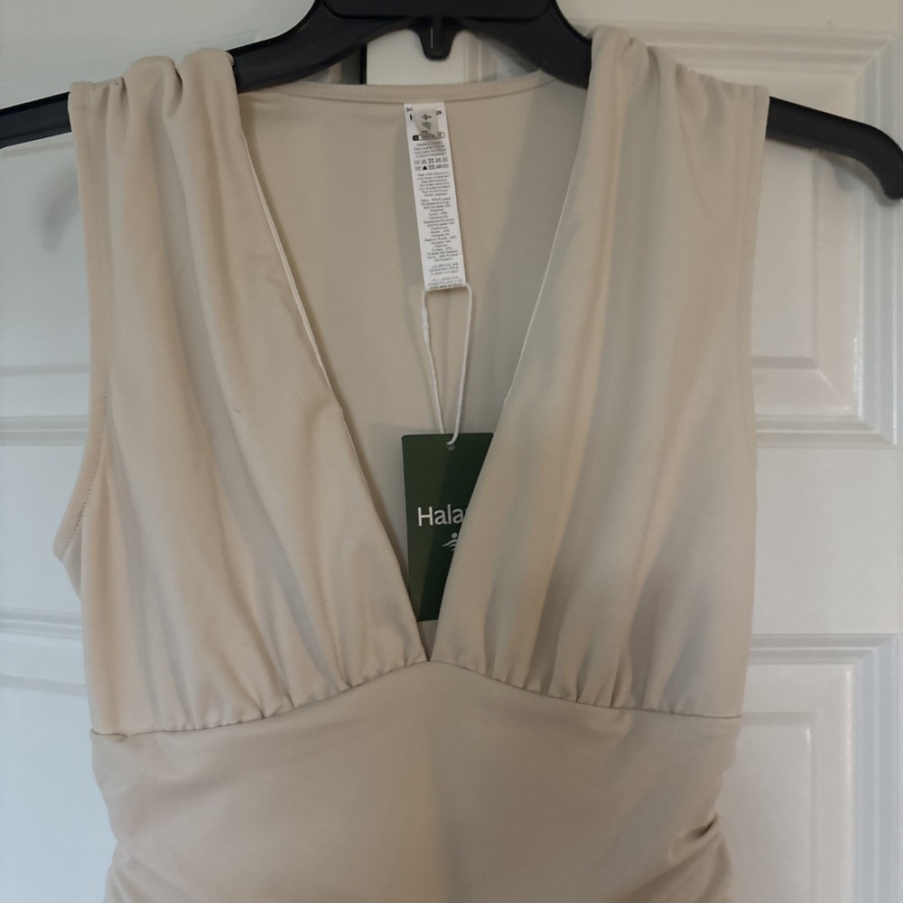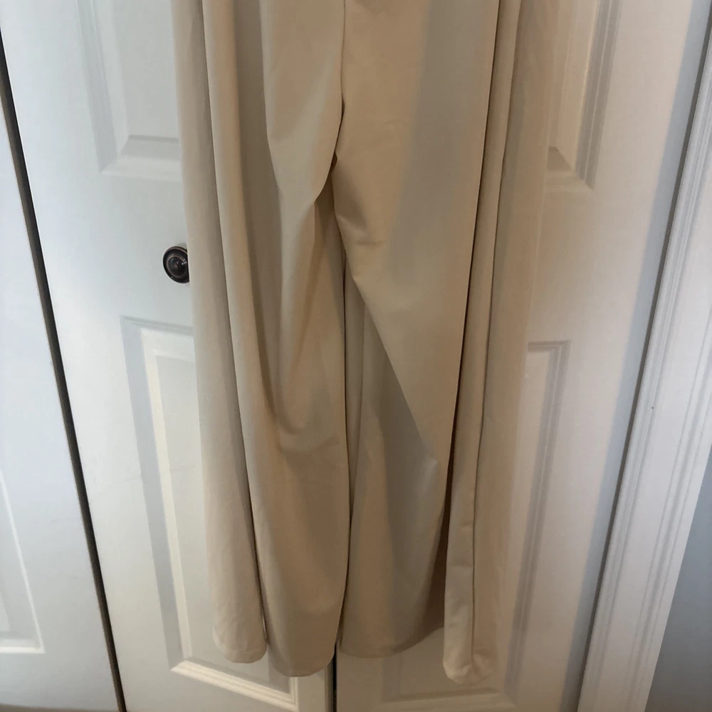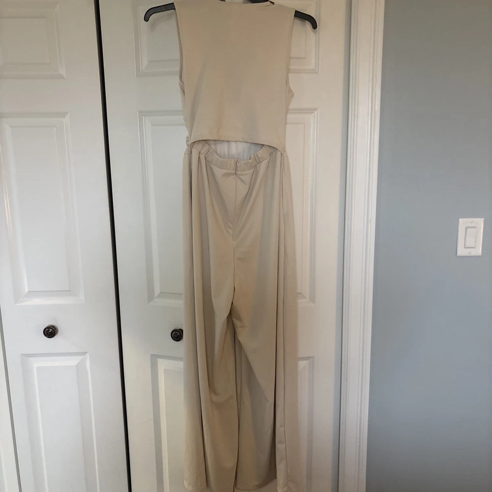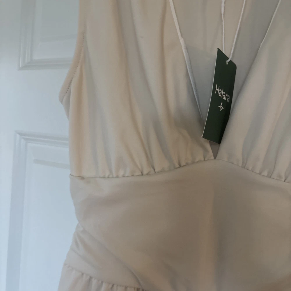 The product is a halara off white jumpsuit in women's size medium, featuring a sleeveless design with a V-neckline. It is a one-piece garment perfect for casual occasions, made of polyester material that is machine washable. This ivory jumpsuit has a wide-leg style, ideal for the summer and spring seasons. It is a stylish and versatile option for any woman's wardrobe, representing the brand's standard size and regular fit.