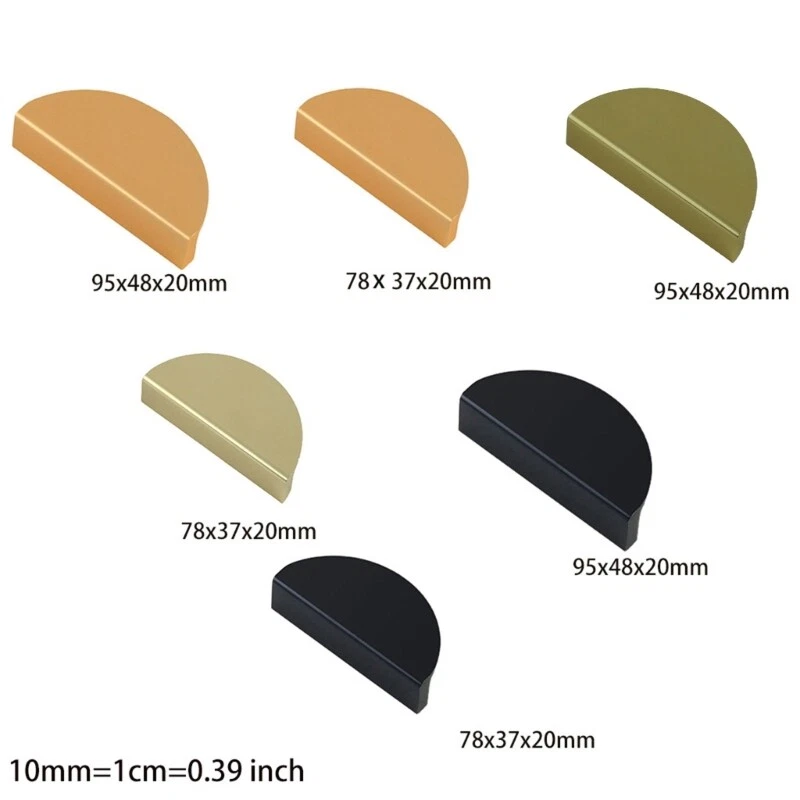 Features: brand new and high quality 1Set handle comes with 2 screws.The screw length is 22mm/0.87in,suitable for 18mm/0.71in normal panels. It can be easily and quickly installed with a screw installation tool,hardware knob comes with convenient screws. Suitable for kitchen, bathroom, sturdy room, office or in cabinets,wardrobes The edges of these pulls are neatly cut, and you will get a comfortable feeling when you for touch it. The pulls is safe, strong, durable, and can provide you with a long-term service. Specifications: Material:Aluminum Alloy Color Black Brushed,Gold Shape: Semi-circle Option Size: Smail Size:78mm/3.07in(L) x 37mm/1.46in(for x 20mm 0.79in with Hole Distance: 64mm/2.52in Large Size:95mm/3.74in(L) x 48mm/1.89(for x 20mm 0.79in with Hole Distance: 64mm/2.52in Package Includes: 1xAluminum Alloy Knob 2xScrews(Length:22mm/0.87in) note: Please allow 1-2cm errors due to manual measurement, make sure that you do not mind before you order. Due to the difference between different monitors, the picture may not reflect the actual color of the item.