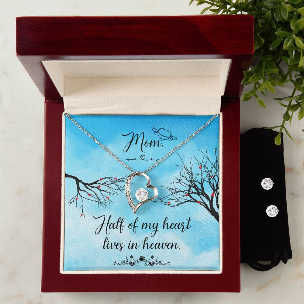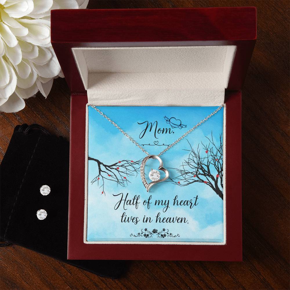 Give your loved one a gift that will make their heart swell! The Forever Love Necklace and Cubic Zirconia Earring Set is sure to do the trick. This necklace and earring pairing provides dazzling sparkle when worn together or separately, and is perfect for any occasion! Do not miss out on this special offering! Necklace Specifications 14k white gold finish 6.5mm round cut cubic zirconia crystal 0.8" (2.2cm) / 0.7" (1.8cm) Adjustable cable chain: 16" - 22" Lobster clasp attachment Earring Specifications 14k white gold finish 6mm round cut cubic zirconia crystals Post style backing Your piece is lovingly packaged in a complimentary soft touch box for easy gifting. Elevate your presentation by upgrading to the mahogany style luxury box, which features a brilliant LED spotlight.