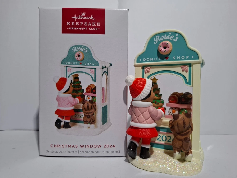 Sweeten the holidays and your Hallmark Keepsake Ornaments collection with the newest shop on the block—Rosie's Donut Shop—crafted by Keepsake artists Nina Aubé and Robert Hurlburt for the 22nd ornament in the Christmas Windows collector's series. A cute little girl and her cat peer inside, smiling at a festive Christmas tree made of stacked donuts and pastries decorated with snowman and reindeer faces. Glistening with glittery snow accents, this KOC member exclusive Christmas tree ornament is sure to brighten your holidays. Key Features: 22nd in the Christmas Windows Keepsake Ornament series. Message: Rosie's Donut Shop. 2024 Additional Details: Artist-crafted by Nina Aubé and Robert Hurlburt. Christmas tree ornament features hanger attachment. Includes: One 2024 Keepsake Ornament in gift box for easy gift giving, preservation and storage. Approx. Size in Inches: 2.4 x 4.32 x 2.39