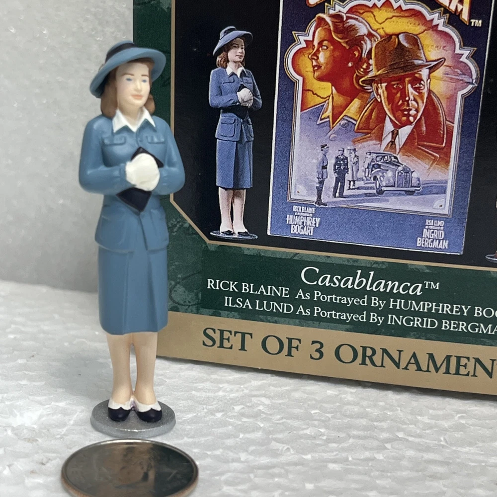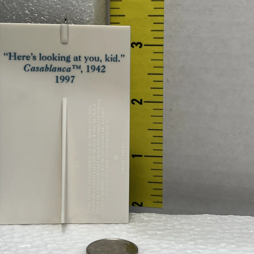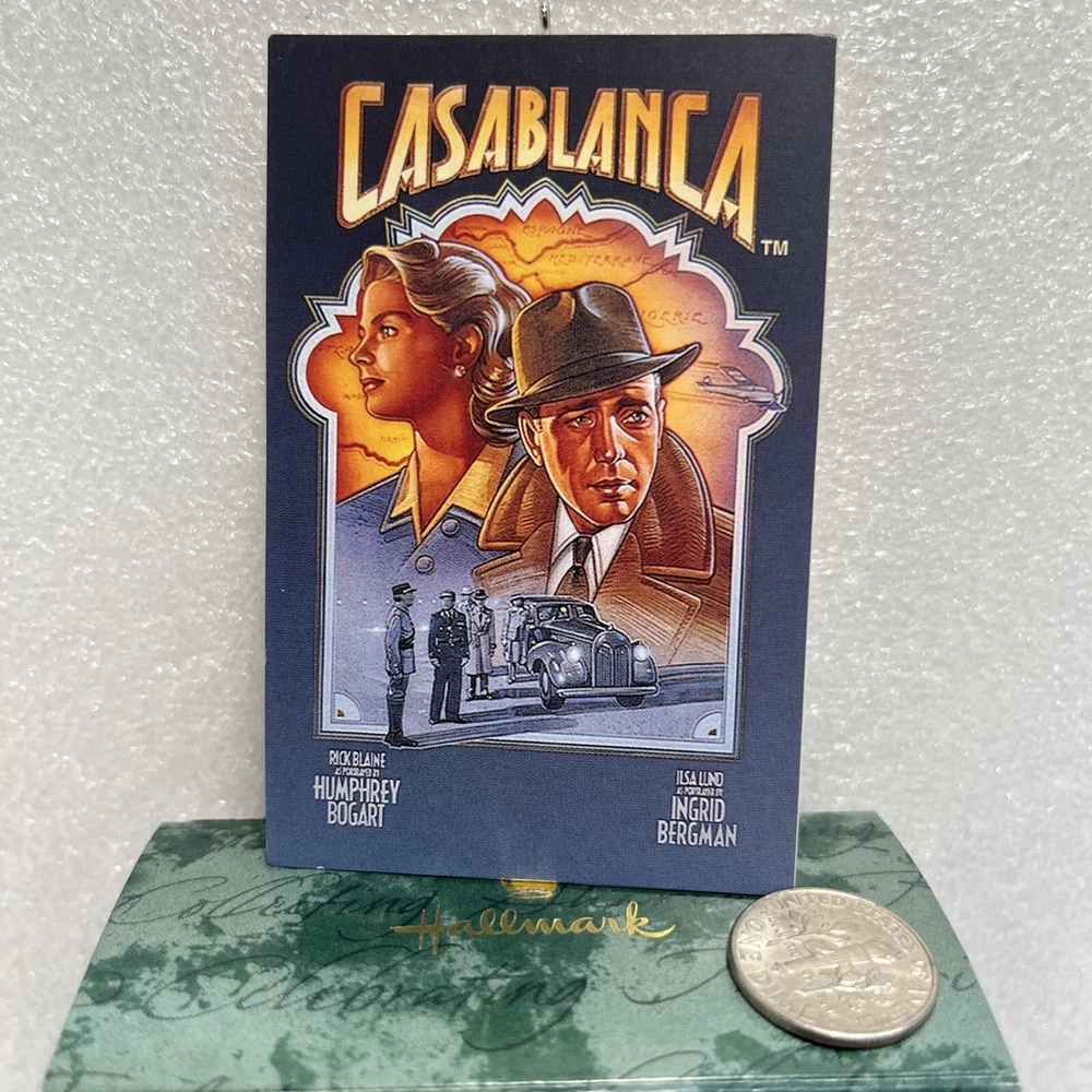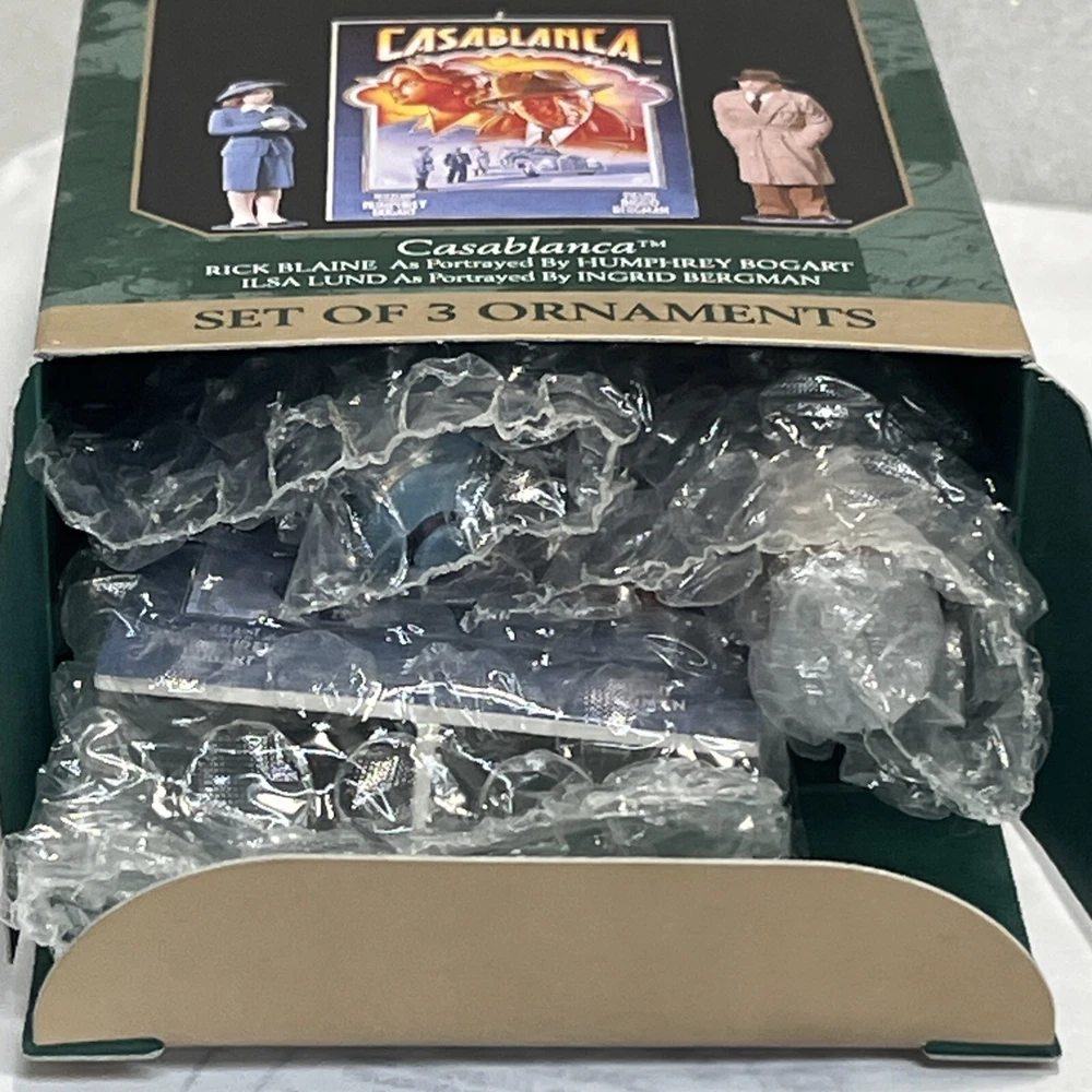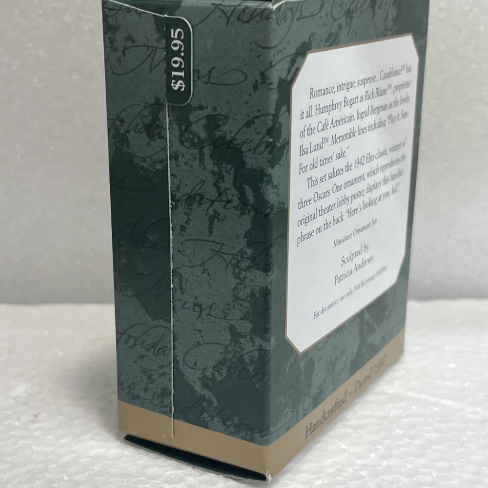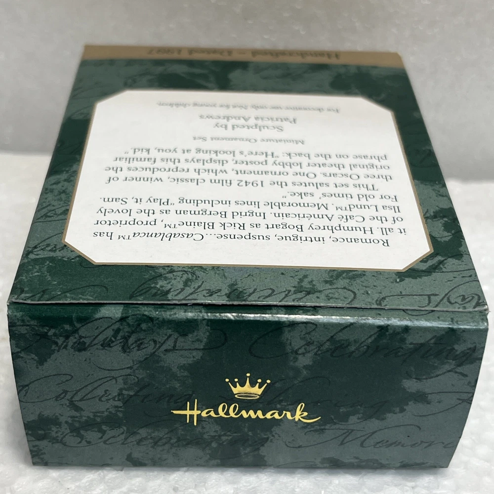 Hallmark CASABLANCA Miniature Ornament Set of 3 Bogart Bergman Poster Hallmark Artist, Patricia Andrews , sculpted this teeny, tiny Miniature Ornament Set in 1997. It features the famous characters from the Classic 1942 film, CASABLANCA. The 3 miniature set includes: Humphrey Bogart as Rick Blaine , proprietor of the Cafe Americain, Ingrid Bergman as lovely Ilsa Lund, "Play it, Sam. For old times' sake", and the reproduction of the original theater lobby poster, with the familiar phrase,... "Here's looking at you, kid." Condition is Brand New stock, Very Good. Box Condition is Very Good to Near-Mint. * See ITEM SPECIFICS in the listing above, as well as photos of this actual ornament and the ornament box. Ships: USPS Ground Advantage