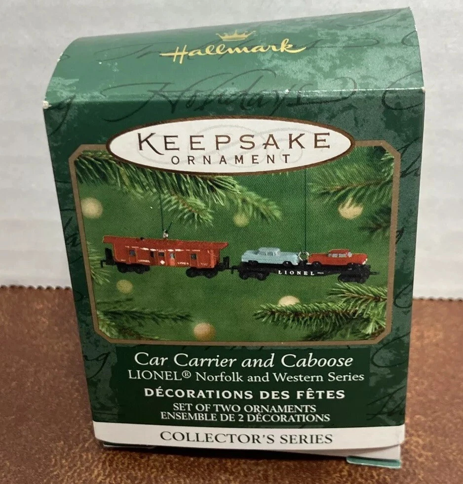 This Hallmark Keepsake miniature ornament set features a Lionel car carrier and caboose from the Norfolk Western collection. Made of diecast metal and measuring 3.25 inches in length. Box is in rough condition Please feel free to contact me with any questions you have