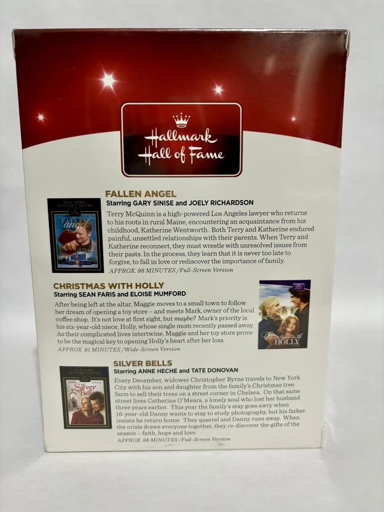 Region Code: DVD: 1 (US, Canada...) Aspect Ratio: 4:3 Movie/TV Title: Fallen Angel, Christmas With Holly, Silver Bells Director: Anne Heche Country/Region of Manufacture: United States Language: American English Season: Christmas Sub-Genre: Christmas Studio: Hallmark Features: Full Screen, Widescreen Format: DVD Type: Movie Genre: Children's & Family UPC: 795902419073 Edition: Box Set, 3 DVD Set Video Format: NTSC Actor: Gary Sinise Case Type: Tall/DVD Case gtin13: 795902419073 Release Year: 2013 Run Time: Various Rating: G