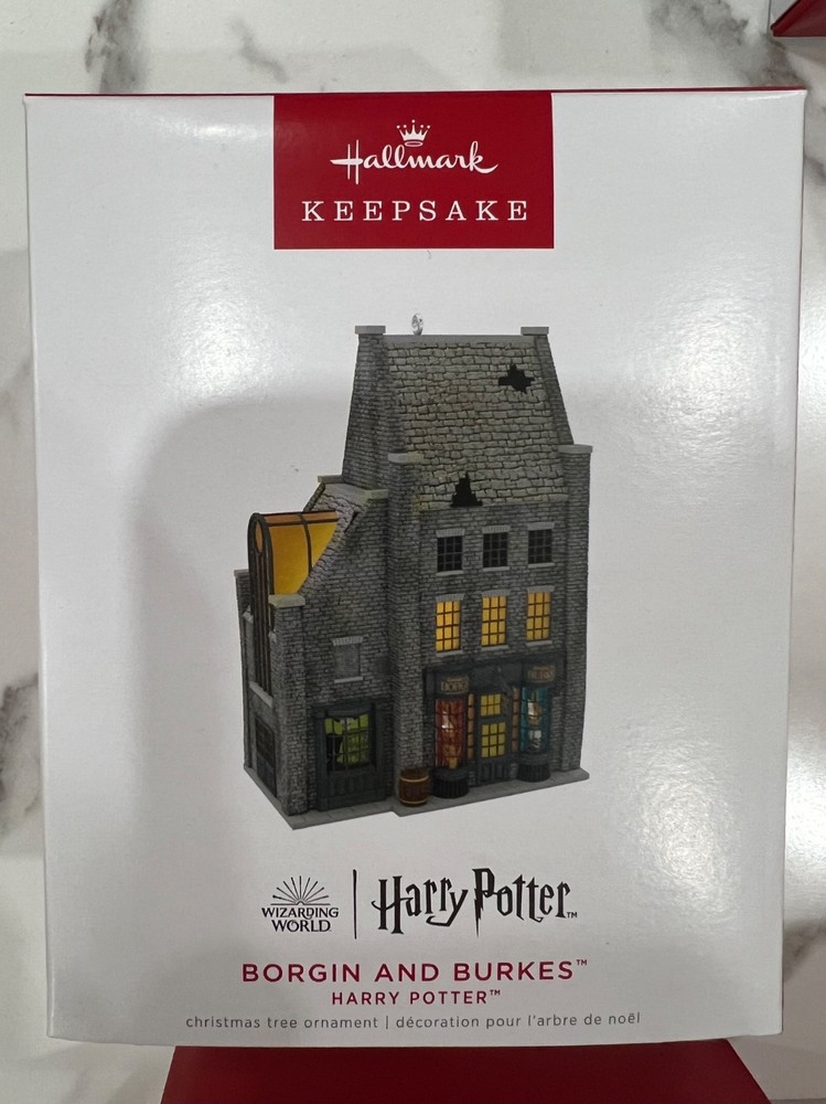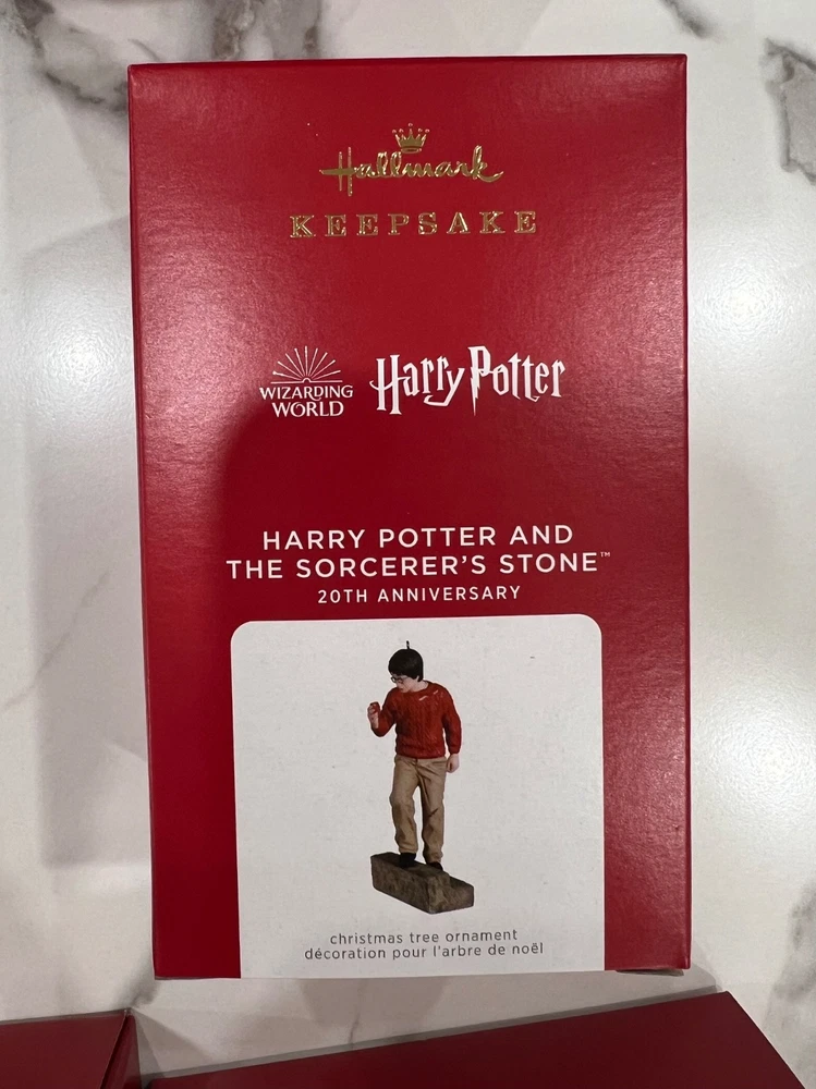The product is a Hallmark Harry Potter ornament set that includes a Sorting Hat, inspired by the iconic item from the Harry Potter series. The set is part of the Three Broomsticks Borgin Burkes Quidditch collection, specifically designed for fans of the wizarding world. With a festive and magical touch, this ornament is perfect for collectors or fans of the Harry Potter series looking to add a unique and enchanting piece to their decor. And the Harry Potter and the Socerer's Stone.