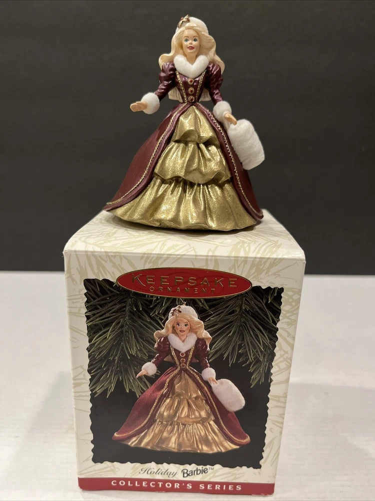 This Hallmark Holiday Barbie ornament is a must-have for collectors. It features the iconic Holiday Barbie character in a festive pose, surrounded by intricate decorations. The ornament is part of the 1996 Collector's Series Keepsake collection, making it a valuable addition to any holiday ornament collection. The ornament is made in China and comes in its original box. It is perfect for display or as a thoughtful gift for any Holiday Barbie fan. Add this beautiful ornament to your collection today! Ornament and box in like new condition