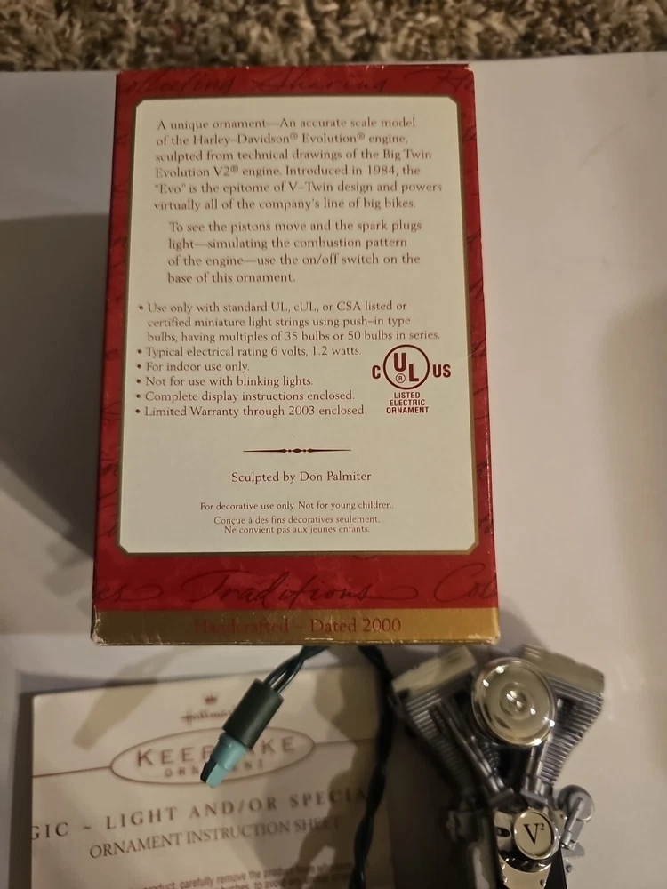 This Hallmark Keepsake Big Twin Evolution Engine ornament is a must-have for any Harley-Davidson fan. Featuring lights and motion, it brings the iconic engine to life. The ornament was manufactured in 2000 and is part of the Harley-Davidson collection. Perfect for adding a touch of holiday spirit to your décor, this ornament is sure to impress.