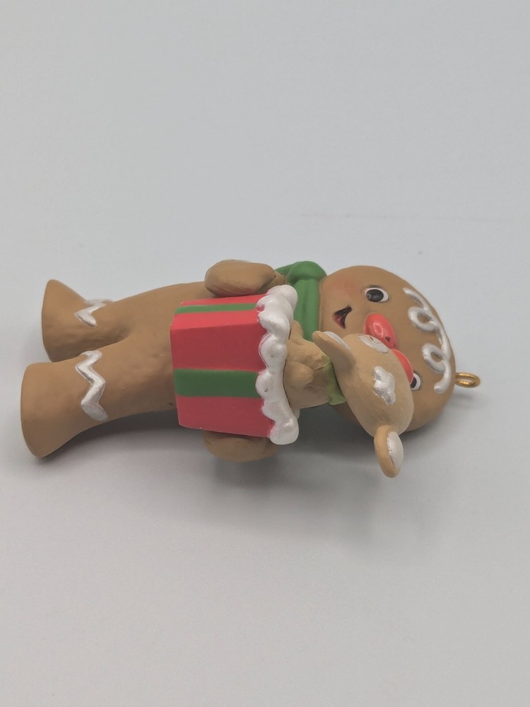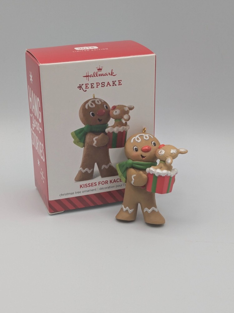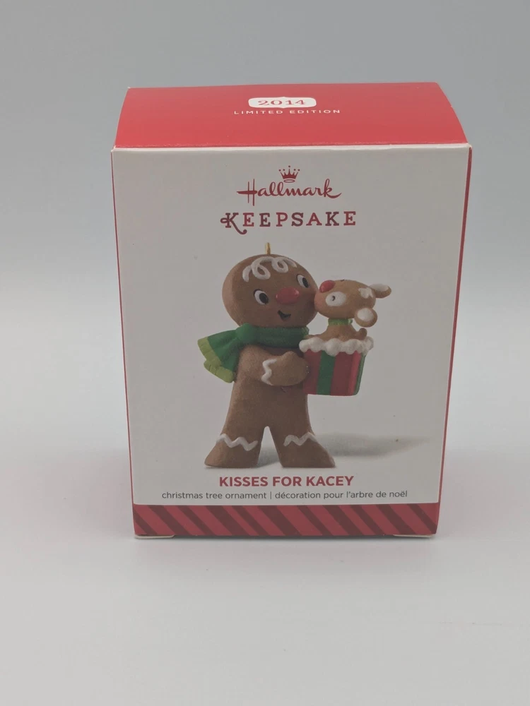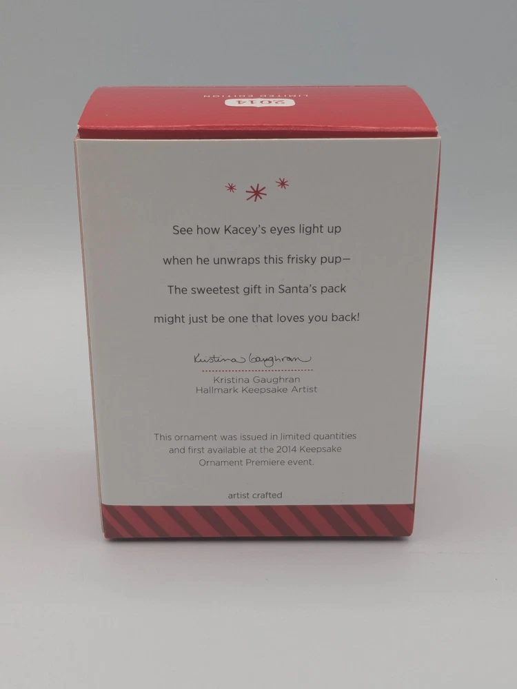 Delight in the charm of the 2014 Hallmark Keepsake Kisses for Kacey Limited Edition Christmas Ornament. Designed by Kristina Gaughran, this artist-crafted piece captures the joy of a gingerbread child receiving a frisky puppy for Christmas. Featuring the heartwarming verse: "See how Kacey's eyes light up when he unwraps this frisky pup - the sweetest gift in Santa's pack might just be one that loves you back!" Pre-owned and in excellent condition, the ornament’s box shows some wear due to age. A must-have for dog lovers and holiday enthusiasts alike. We ship same day / next day! This item comes from a smoke-free and dog-free home. Our ornaments are carefully packed -- bubble wrapped and always shipped in a box -- to guarantee their safe arrival to you. #hallmark #hallmarkornament #hallmarkkeepsake #hallmarkornaments #hallmarkkeepsakeornament #kissesforkacey #christmasornament #cbtreasures