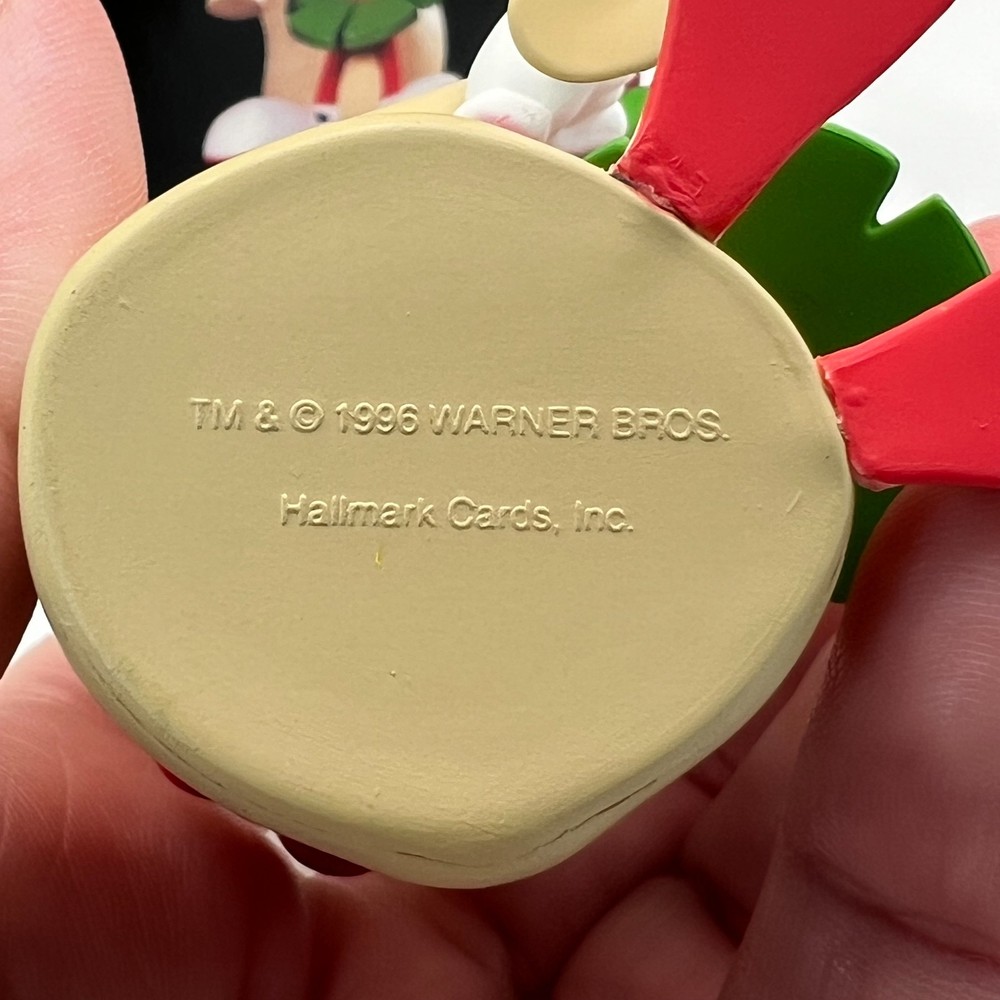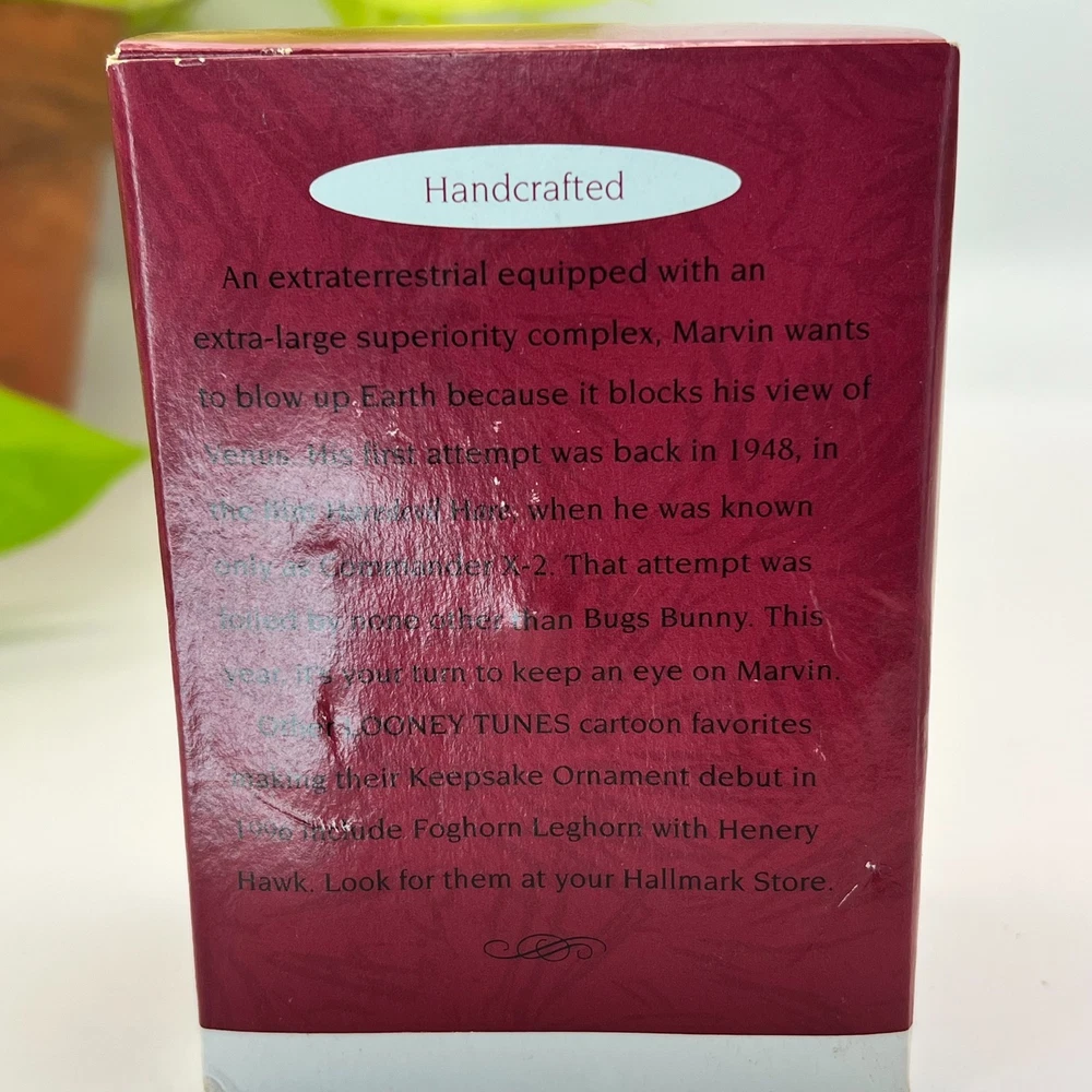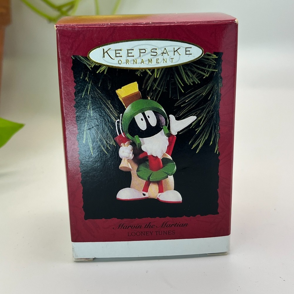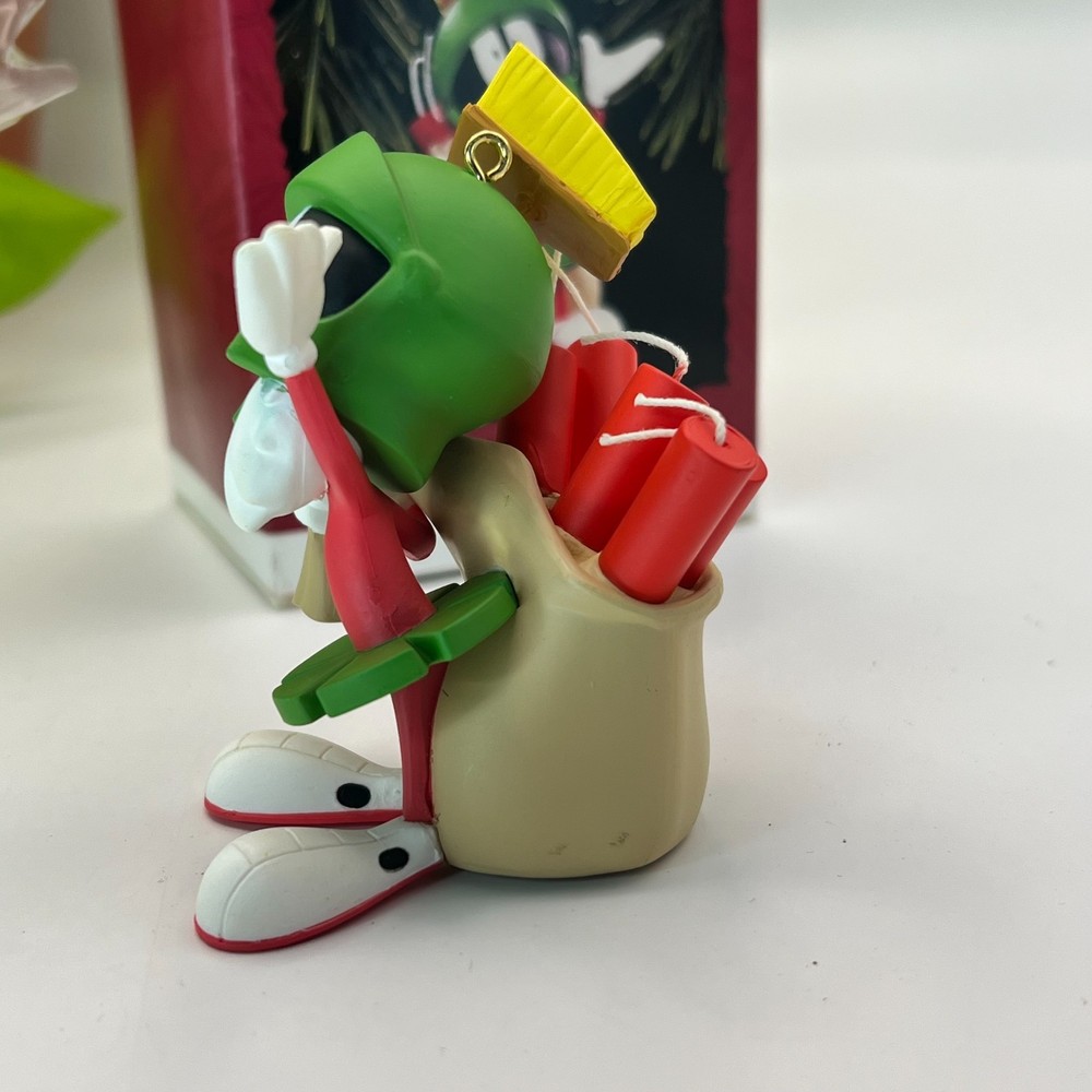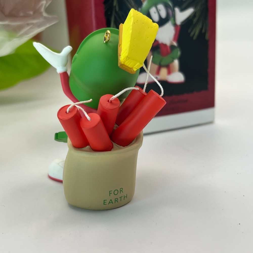 Hallmark Keepsake Marvin the Martian Christmas ornament from the Looney Tunes series. This ornament is unused and comes with the original Hallmark box. Made of molded resin with hand painted details. Features Marvin holding explosives with a For Earth bag in a classic 1990s character design. Condition notes Ornament itself is clean and unused One side of the ornament shows light discoloration see photos Box shows normal shelf wear from storage A great addition for Hallmark collectors or Looney Tunes fans. Ships carefully packed.