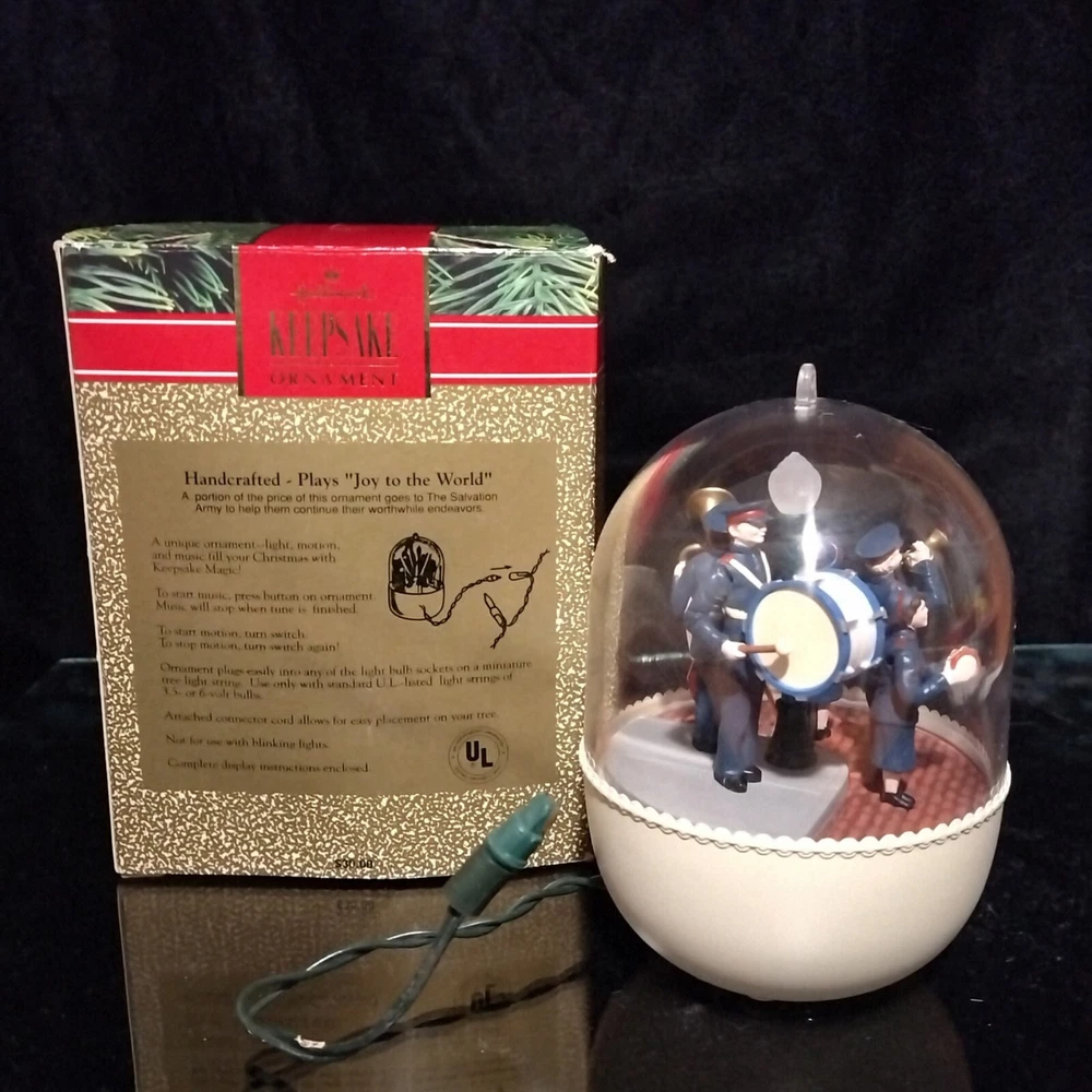 This Hallmark Keepsake Ornament is a beautiful addition to your Christmas decor. It features an oblong shape with a clear dome with moving figures. The ornament is made of plastic and measures 3 1/4" in length and width, with a height of 5". It is an original, handmade piece from 1991 that is perfect for any recipient. The ornament comes with lights, motion, and music, featuring the classic Salvation Army Band. The joy to the world theme is perfect for the holiday season. This collectible is part of the Hallmark Keepsake Ornaments collection and is an excellent gift for anyone who loves vintage ornaments. This is a discontinued ornament. * Tears on top of box at opening. Tested See photos