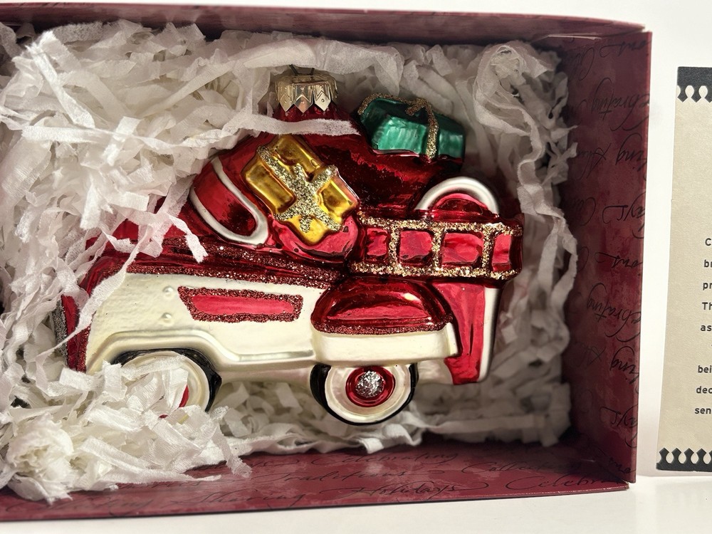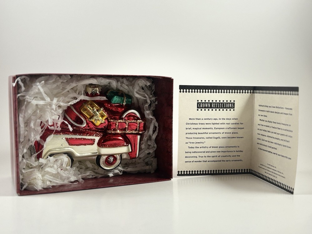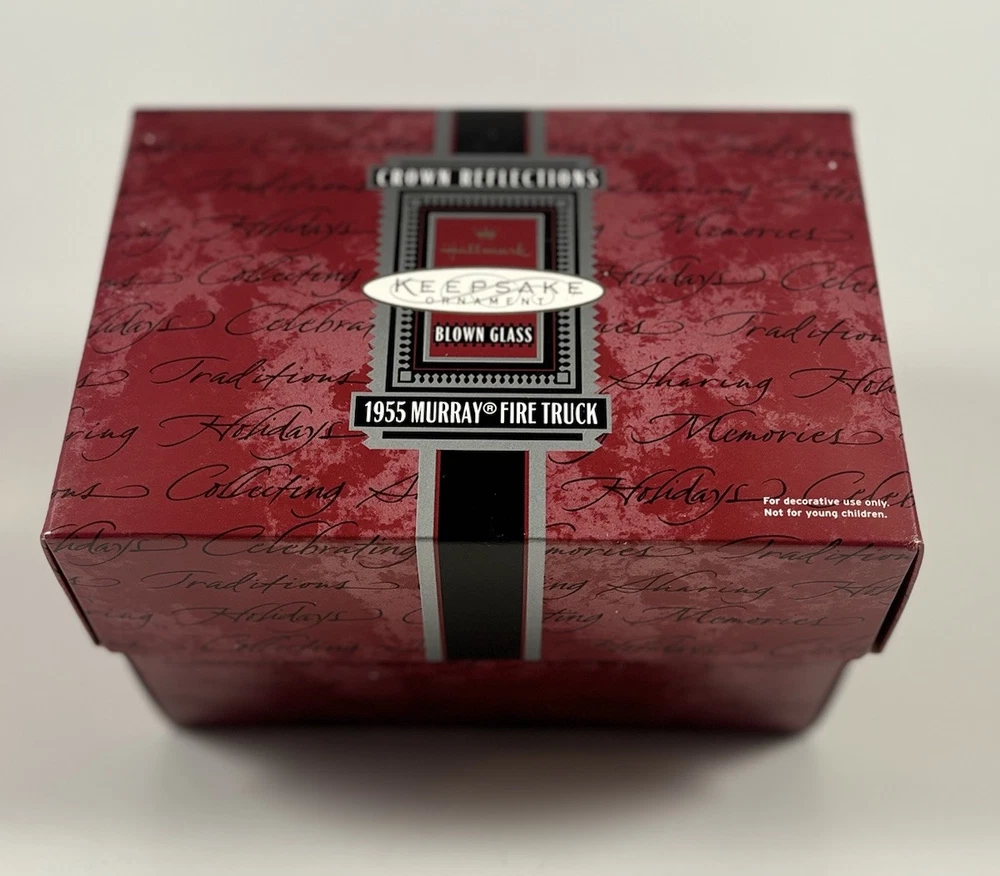 Year Manufactured:1998Item:Hand blown glass ornamentDepartment:AdultsSet Includes:OrnamentCountry of Origin:PolandTheme:ChristmasSubject:TrucksHandmade:NoAge Level:Over 18 YearsType:OrnamentCharacter:FireCollection:OrnamentsBrand:HallmarkVintage:YesMaterial:GlassOrnament:1955 Murray Fire TruckColor:MulticolorOccasion:Christmas