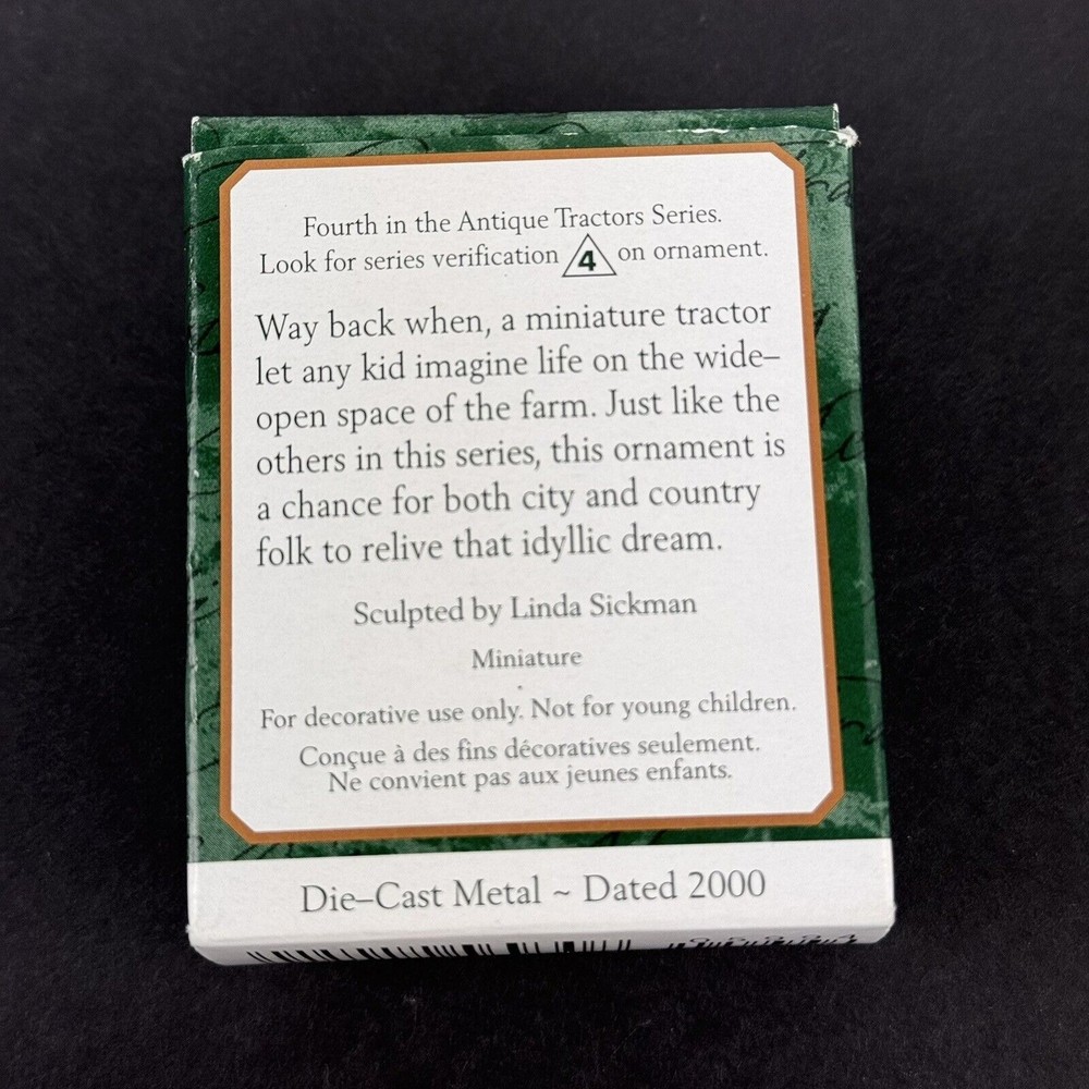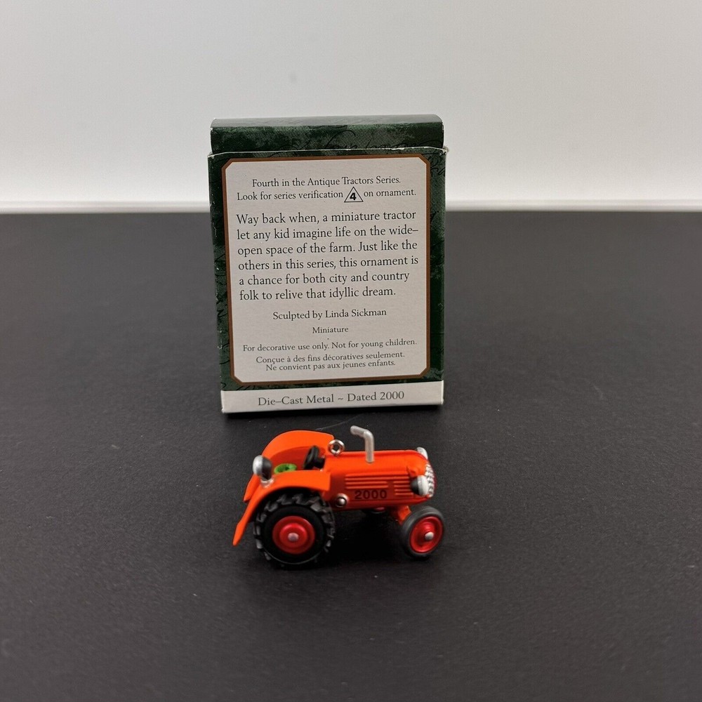 Vintage 2000 Hallmark Keepsake Ornament Orange Die-Cast Metal Miniature Tractor Fourth in The Antique Tractors Collectors Series MRP# QXM5994 Approximate Size: Length: 2-1/2" x Width: 2" Preowned. Ornament is in mint condition. Box is not like new but very good. Any collector card that was originally included is not included. See photos as part of description. This is what you will receive.