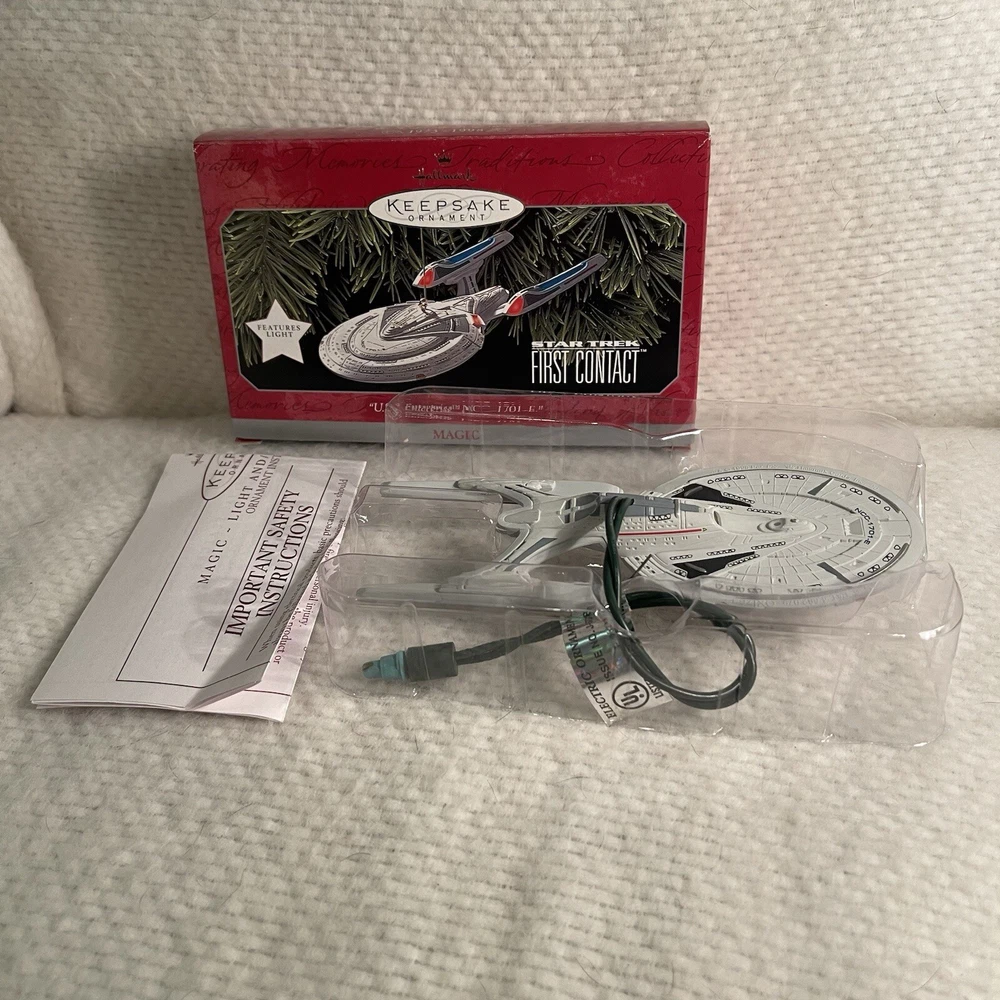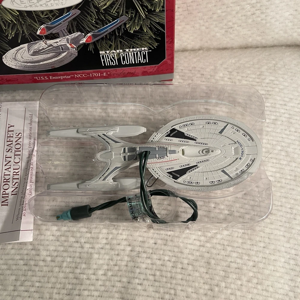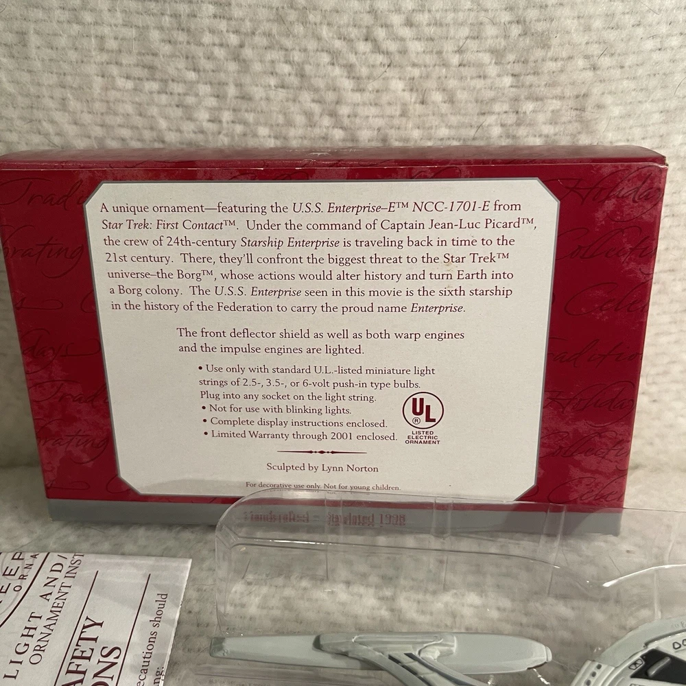 Add this Hallmark Keepsake Ornament to your collection! Featuring the iconic USS Enterprise NCC-1701-E from Star Trek's First Contact, this multicolor ornament is a must-have for any fan of the franchise. Made with mixed materials and measuring 6.5 inches in length and 4 inches in width, this irregularly shaped ornament is perfect for Christmas or any occasion celebrating space exploration. The intricate details of the ornament accurately capture the essence of the USS Enterprise, making it a great addition to any Star Trek collection. Manufactured in 1998 in China, this contemporary style ornament weighs only 2.8 ounces and comes with a set that includes one item. Get ready to embark on a journey through space with this unique Hallmark Keepsake Ornament! Excellent condition. New in original box.