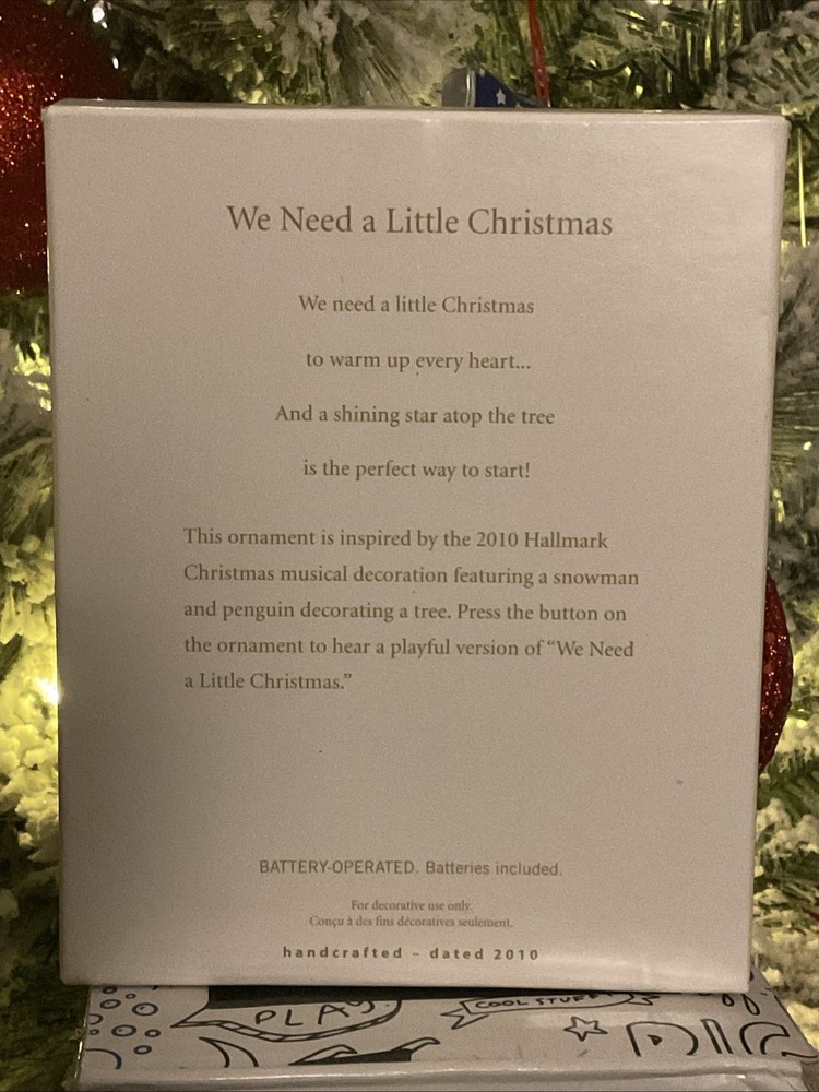 You get the 2010 Hallmark Keepsake “We Need a Little Christmas” Magic Sound ornament (QXI2316) in this listing. This piece shows a snowman holding a candy cane ladder while a penguin in a Santa hat places the star on a small Christmas tree. You press the button and it plays a playful version of the song “We Need a Little Christmas.” • Features: • Magic sound • Battery-operated (requires batteries, not included) • Size: about 3.75 inches high • Artist: Tammy Haddix Your ornament stays new in box (NIB), never removed or displayed. The box shows only minor storage marks. Collectors enjoy these cheerful Magic sound pieces. You hang this duo for holiday music on your tree. Ship it quick and pack it safe with protection. Message me for more photos or questions. Thanks for looking!