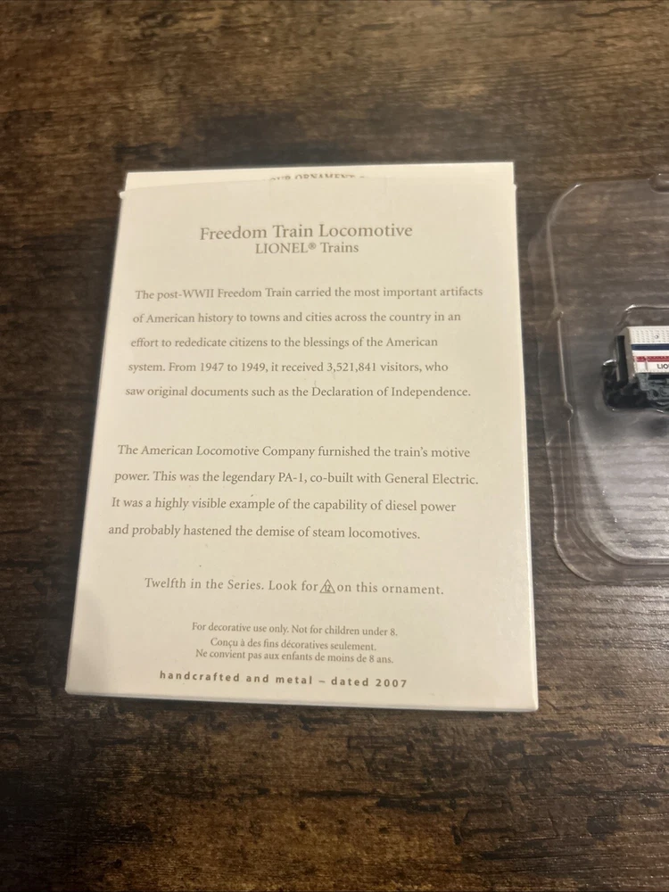 Adorn your Christmas tree with the Hallmark Keepsake Lionel Freedom Train Locomotive, a charming ornament that captures the spirit of holiday nostalgia. Crafted in 2007, this piece hails from the iconic Lionel Trains collection, representing a beloved piece of Americana. The ornament, a white plastic and metal locomotive, is designed to hang gracefully on your tree, adding a touch of elegance and historical reference to your festive decor. This licensed reproduction echoes the glory of the Freedom Train, a symbol of unity and progress, making it a thoughtful addition for enthusiasts of train memorabilia. It's a versatile piece that fits seamlessly within a variety of holiday themes and collections. Whether as a standout gift or a cherished keepsake for your own Lionel train set, this ornament is sure to delight adult collectors and decorators alike.