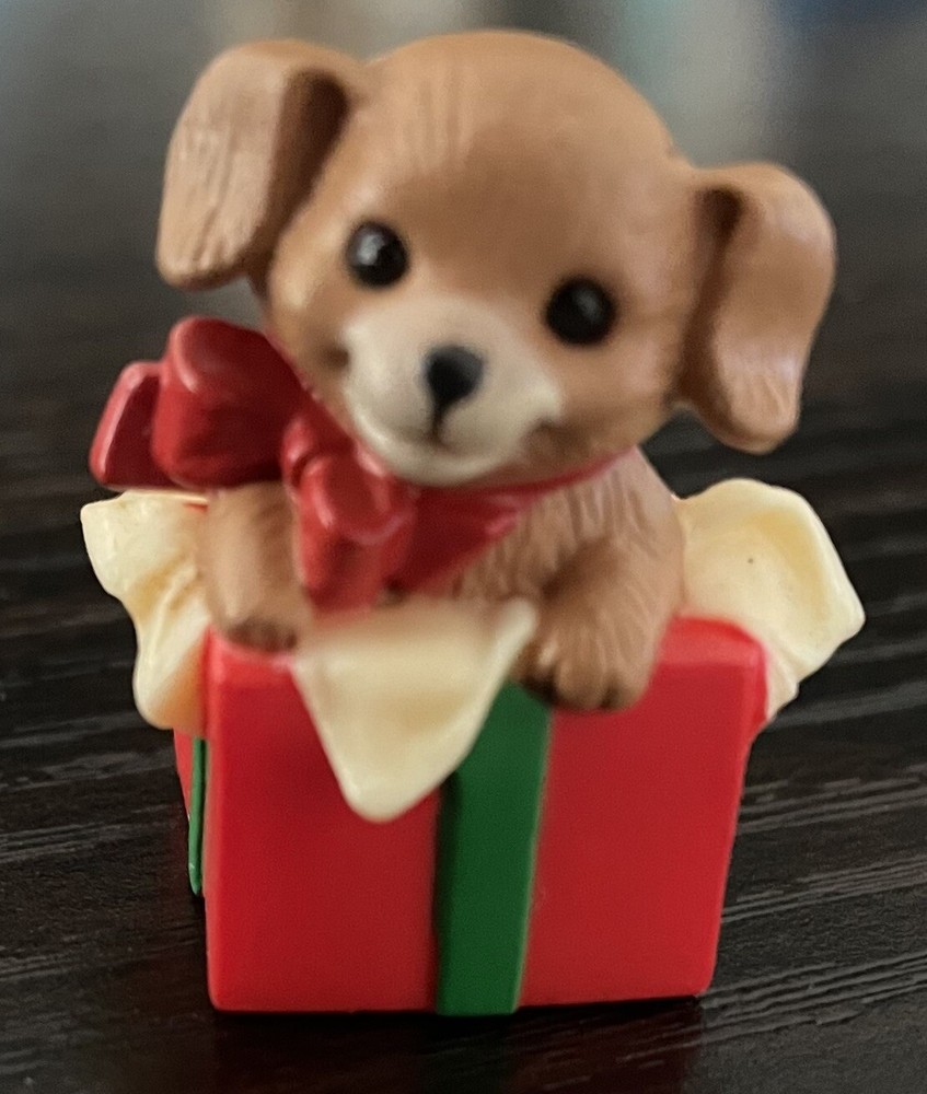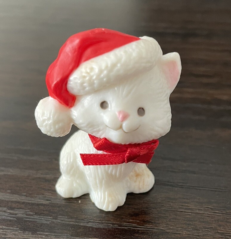 This charming Hallmark ornament set features a waving snowman, a white kitten in her Santa cap and a cute puppy revealing himself as a Christmas present! The set is part of the Merry Miniatures collection, perfect for adding a touch of whimsy to your holiday decorations. These three items are vintage pieces and made in China.