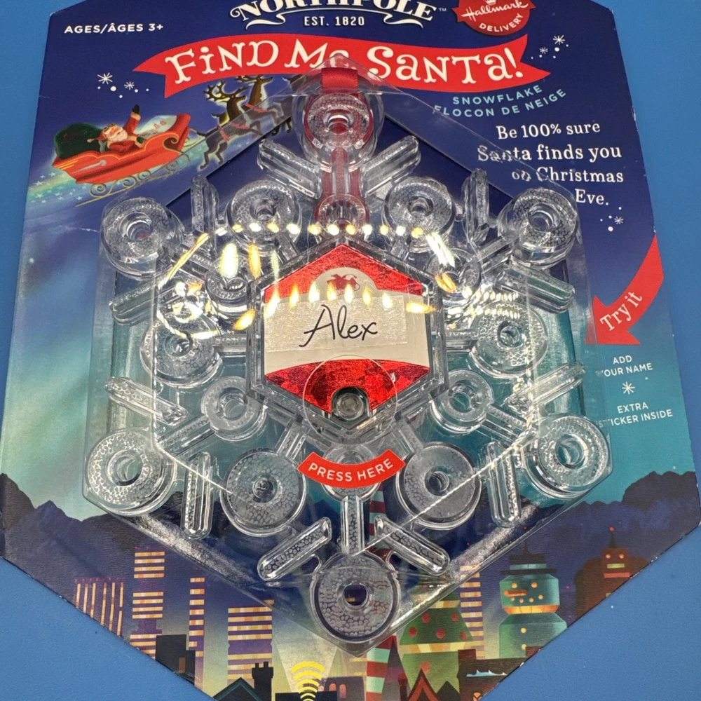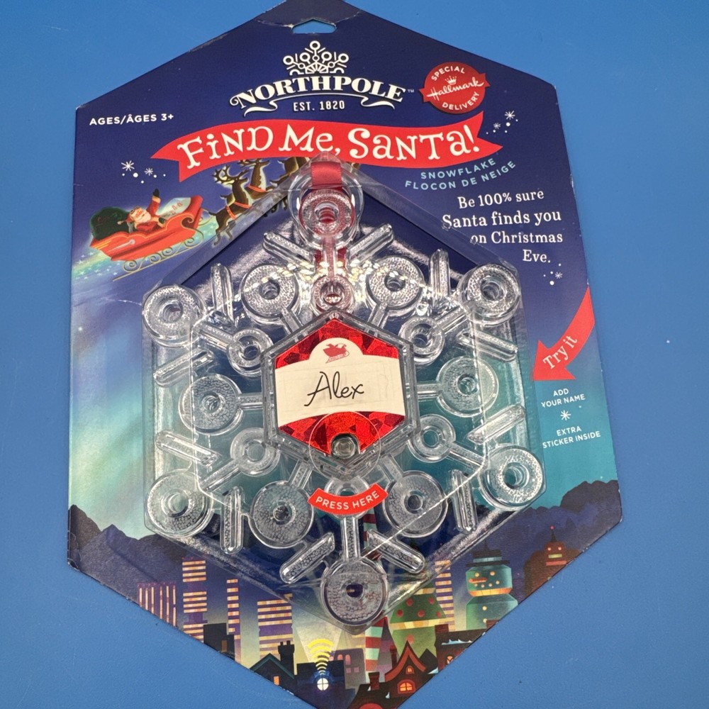 The Hallmark Northpole Find Me Santa Light up Snowflake ornament is part of the North Pole collection and features a plastic snowflake design that lights up. The ornament depicts Santa and is specifically themed for Christmas. It includes lights and is designed to add a festive touch to holiday decorations. Sealed. Never been used. Possible battery replacement. Original box has some curved edges. Please check the pictures carefully as part of the description. Feel free to ask questions if you need more information before you buy it. Thank you for your interest B-7