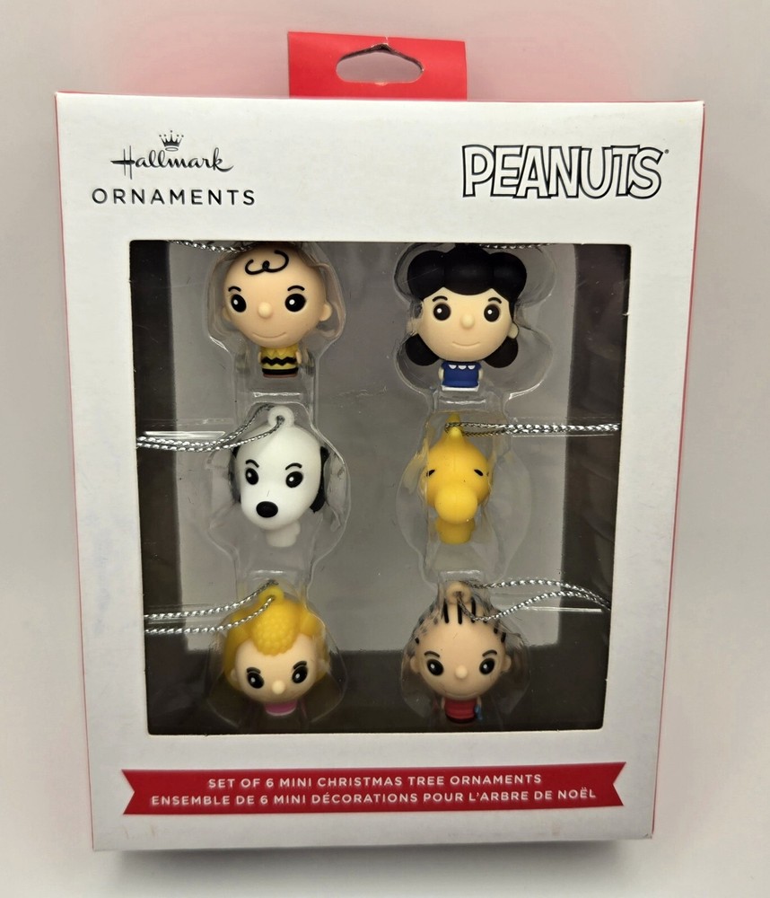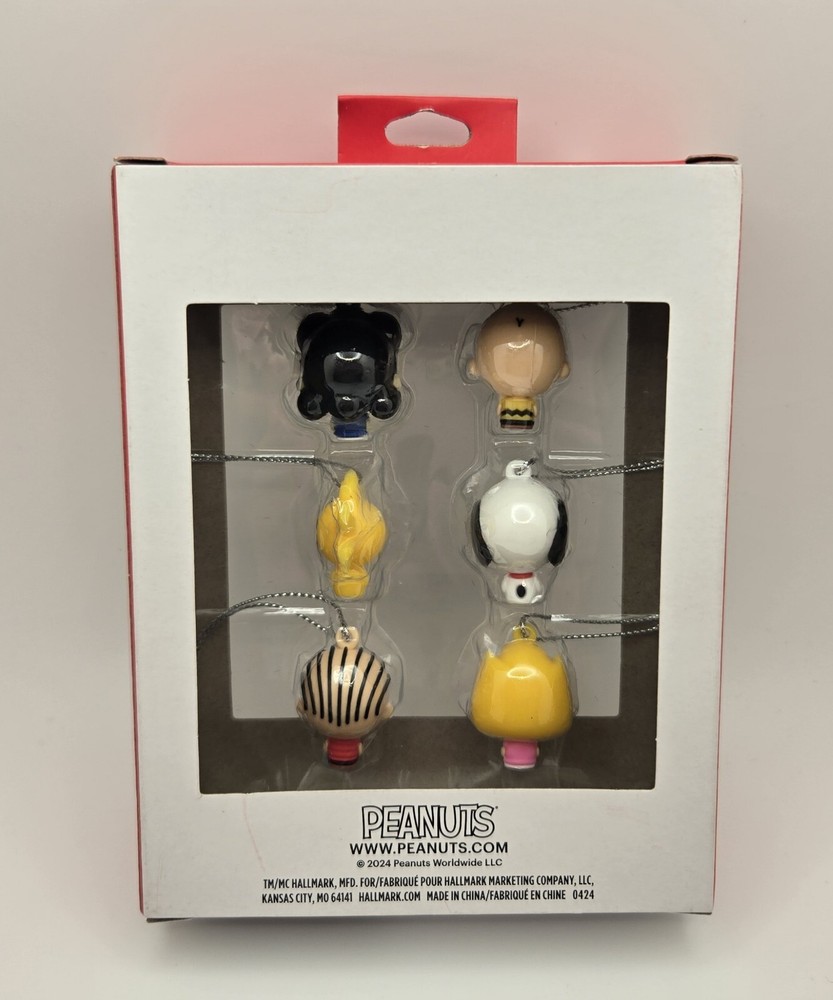 *Shipping with USPS Ground Advantage. Packaged with care (bubble wrap and cardboard shipping box). Smoke-free home.* The product is a set of 6 miniature Peanuts character ornaments by Hallmark for the year 2024. The characters included are Snoopy, Sally, Lucy, Charlie Brown, Woodstock, and Linus. Each ornament is 1 inch tall, features a multicolor design, and comes boxed for easy storage. These ornaments are perfect for Christmas and are part of the Peanuts collection, making them a delightful addition to any holiday decor.