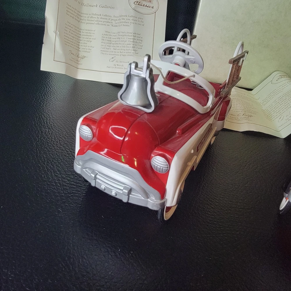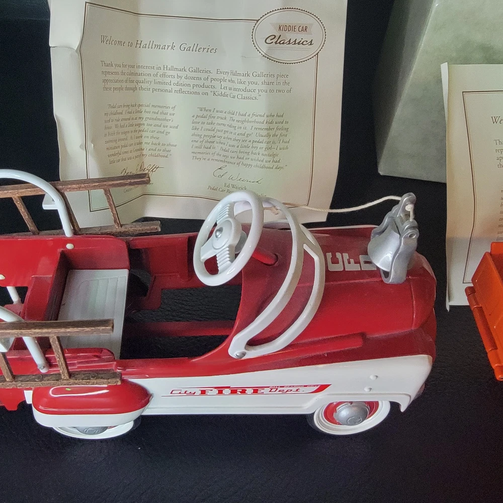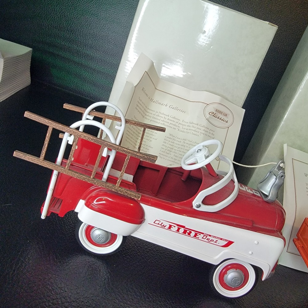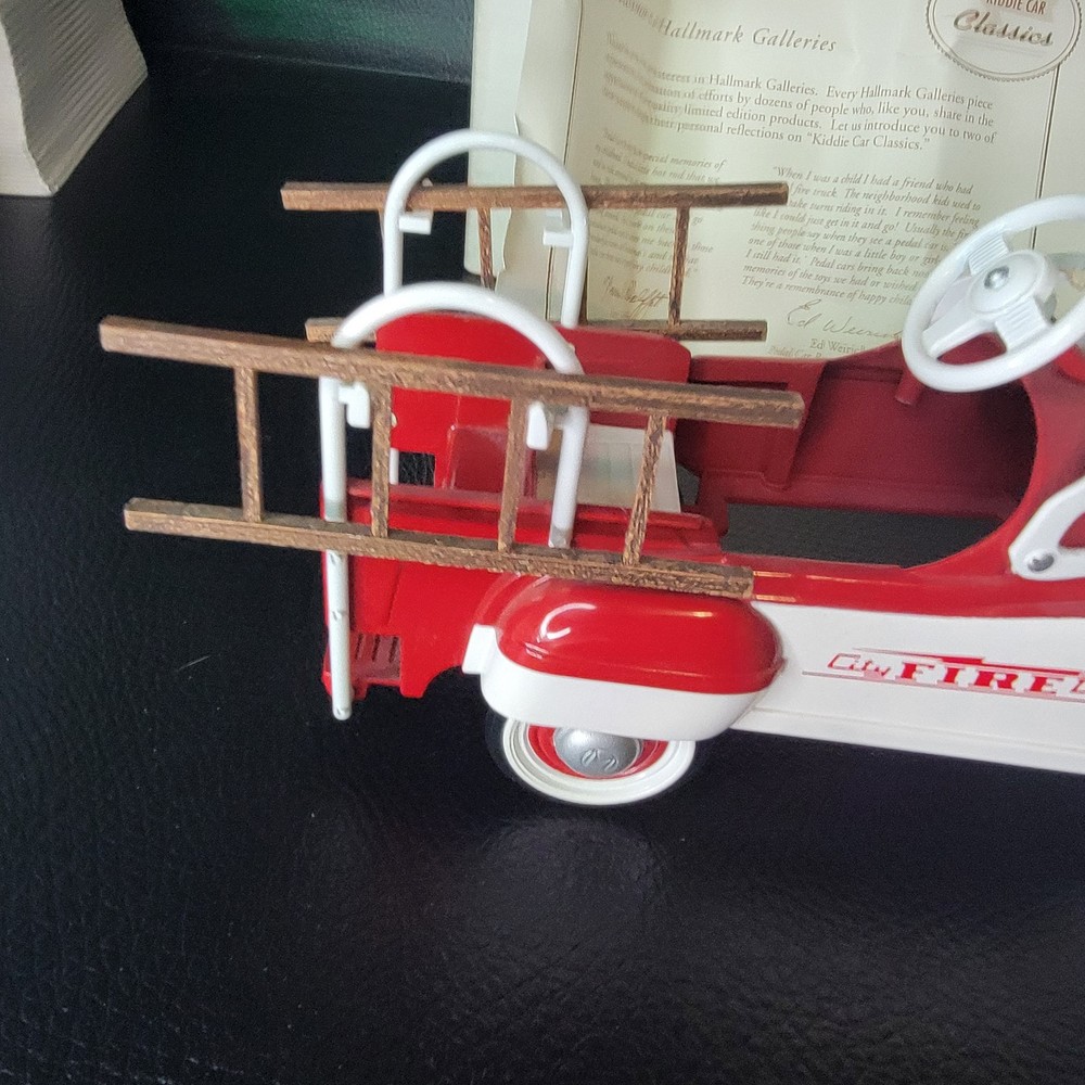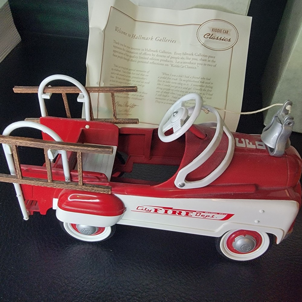 This is a rare and collectible Hallmark Kiddie Car Classics Murray Fire Truck Pedal Car with Ladder. It features intricate details and beautiful design, making it a must-have for any collector of decorative collectibles. The pedal car is in excellent working condition and is perfect for display or as a gift for a child who loves fire trucks and classic toys.