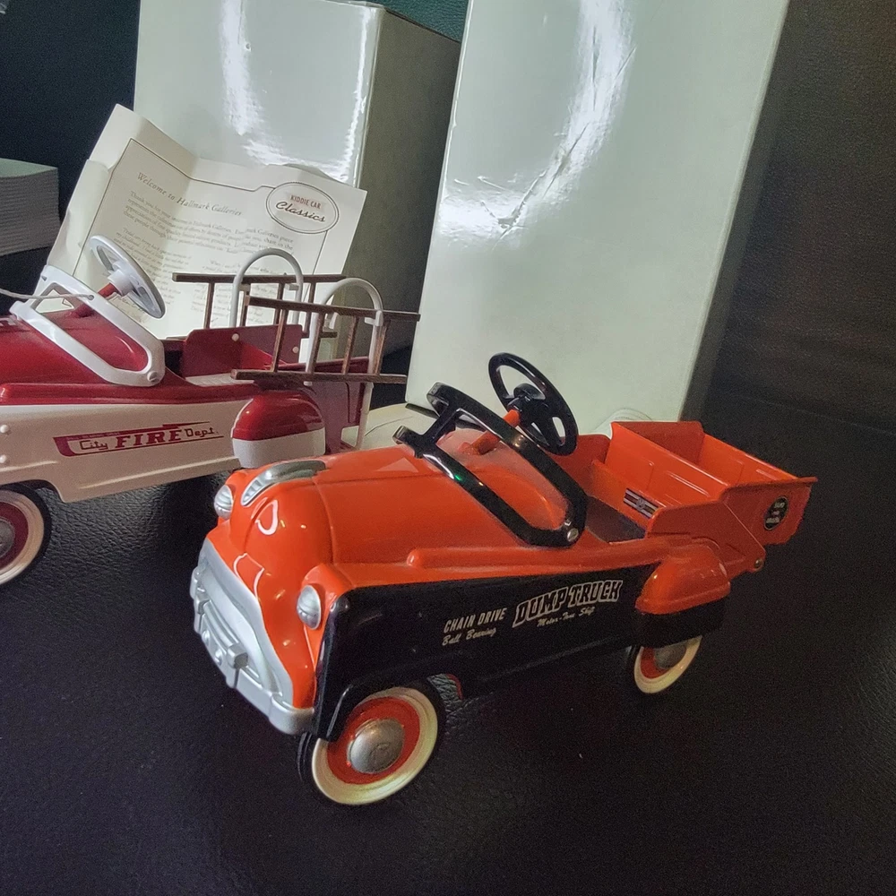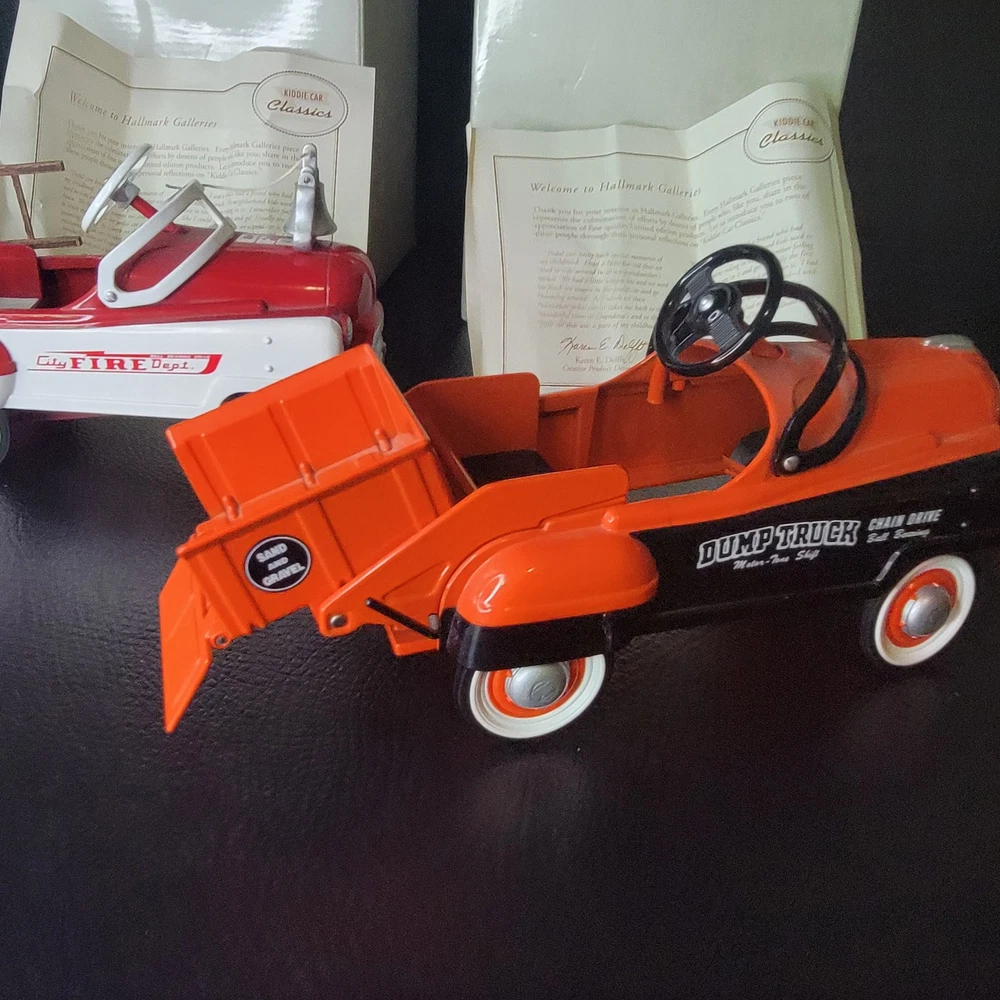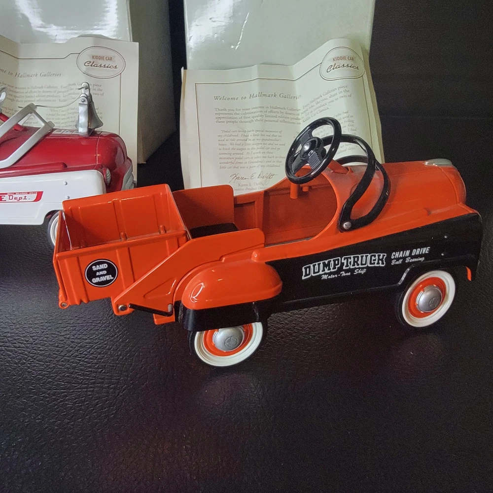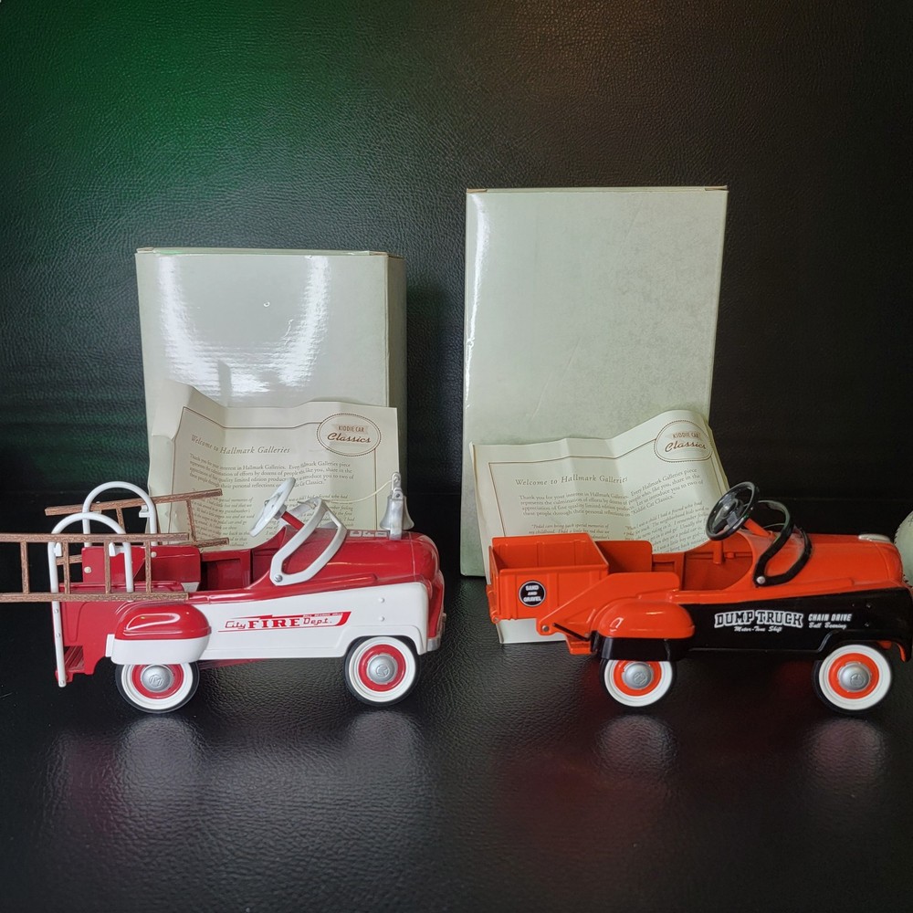 This is a rare and collectible Hallmark Kiddie Car Classics Murray Fire Truck Pedal Car with Ladder. It features intricate details and beautiful design, making it a must-have for any collector of decorative collectibles. The pedal car is in excellent working condition and is perfect for display or as a gift for a child who loves fire trucks and classic toys.