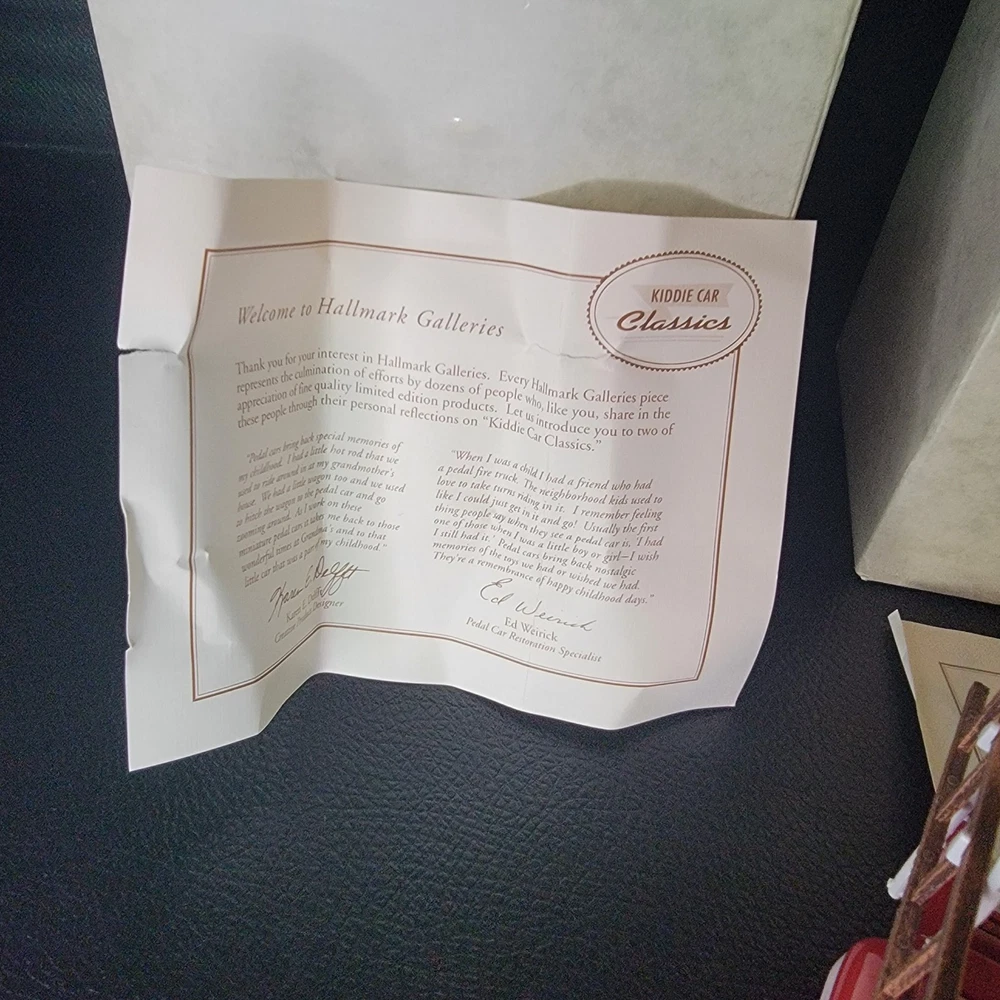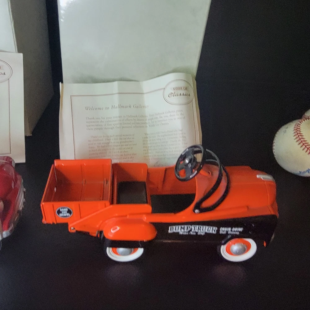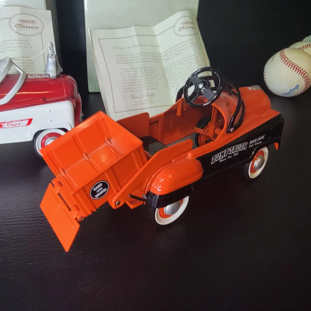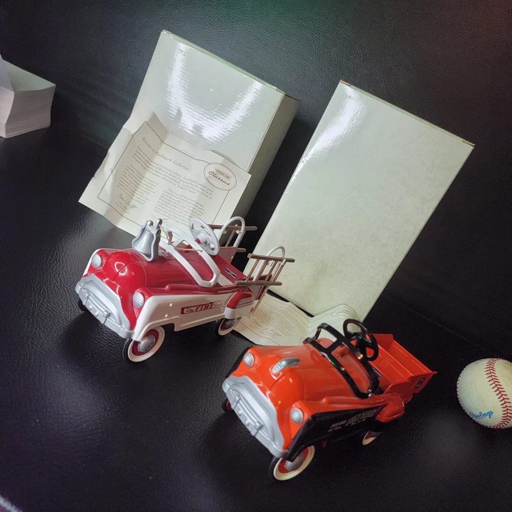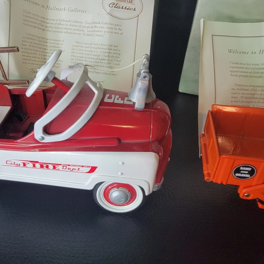 This is a rare and collectible Hallmark Kiddie Car Classics Murray Fire Truck Pedal Car with Ladder. It features intricate details and beautiful design, making it a must-have for any collector of decorative collectibles. The pedal car is in excellent working condition and is perfect for display or as a gift for a child who loves fire trucks and classic toys.