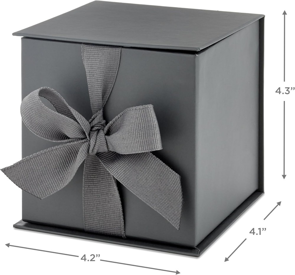 Manufacturer: Hallmark Product Dimensions: 4.2"L x 4.1"W x 4.3"H Item Weight: 5.6 ounces Country of Origin: United States UPC: Does not apply Unit Count: 1.0 Count Color: Slate Gray Theme: Grey,Occasion Type: Does not apply Number of Items: 1 Material: Paper Occasion: Birthday Pattern: Solid Brand: Hallmark gtin13: Does not apply Included Components: Card, Lid, Ribbon Package Dimensions: 4.57 x 4.53 x 4.33 inches Customer Reviews: 4.9/5
