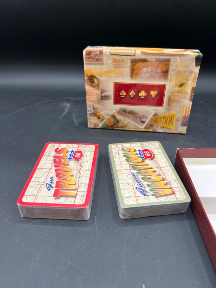 The Hallmark Travels Vacation Route 66 Double Deck Playing Cards are a beautifully designed set featuring a travel theme inspired by the iconic Route 66. Made in China, these modern playing cards are perfect for collectors and enthusiasts of unique card games. The double deck set includes all the cards needed to enjoy a fun game night with friends and family, making it a great addition to any card game collection.