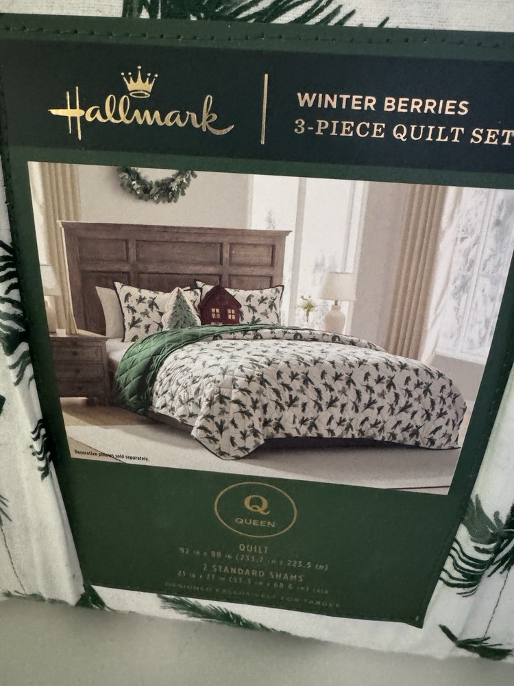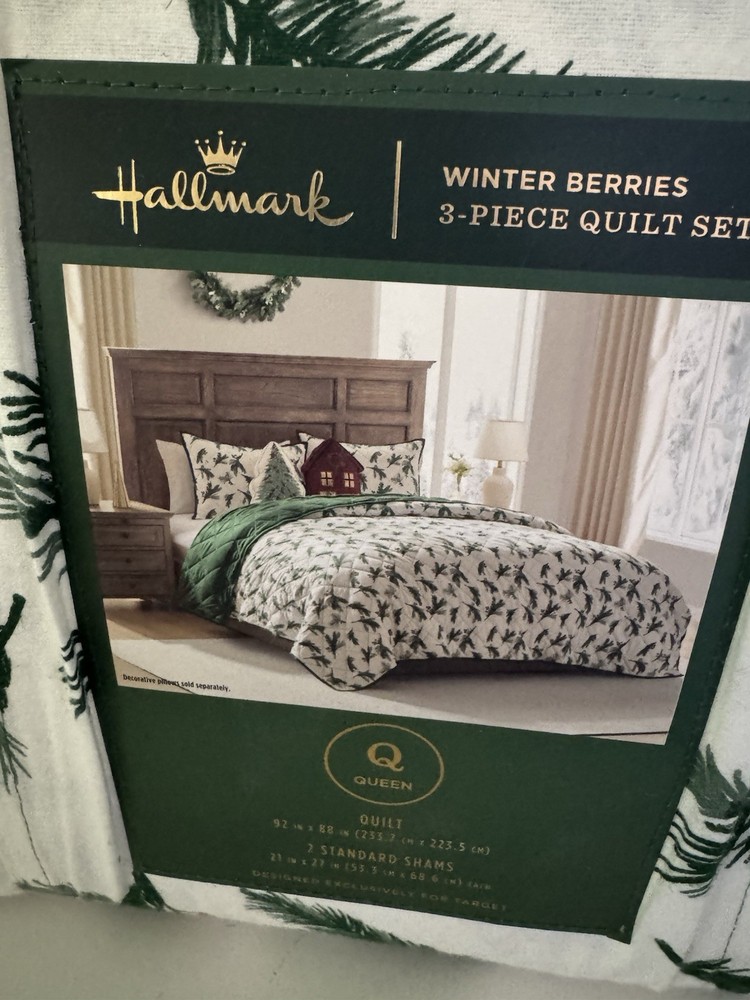 The Hallmark Winter Berries Queen 3-Piece Quilt Set is a charming addition to any bedroom, featuring a floral holiday theme in white, green, and red colors. Made from 100% cotton with a 100% polyester fill, this rectangular quilt set is machine washable for easy care. The quilt set includes a quilt and two pillow shams, all with a quilted finish and measuring 92 inches in length and 88 inches in width. Perfect for adults, this set brings a touch of nature and holiday cheer to any bedroom during the festive season.