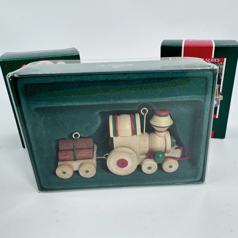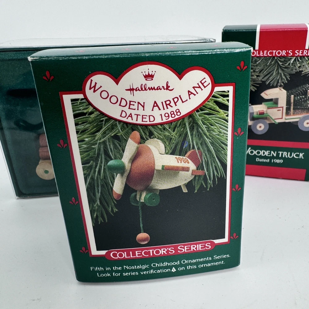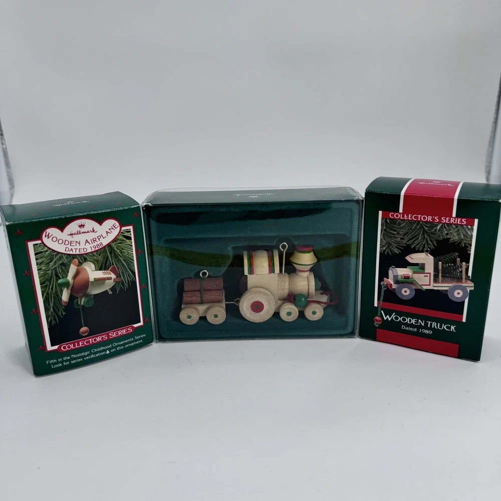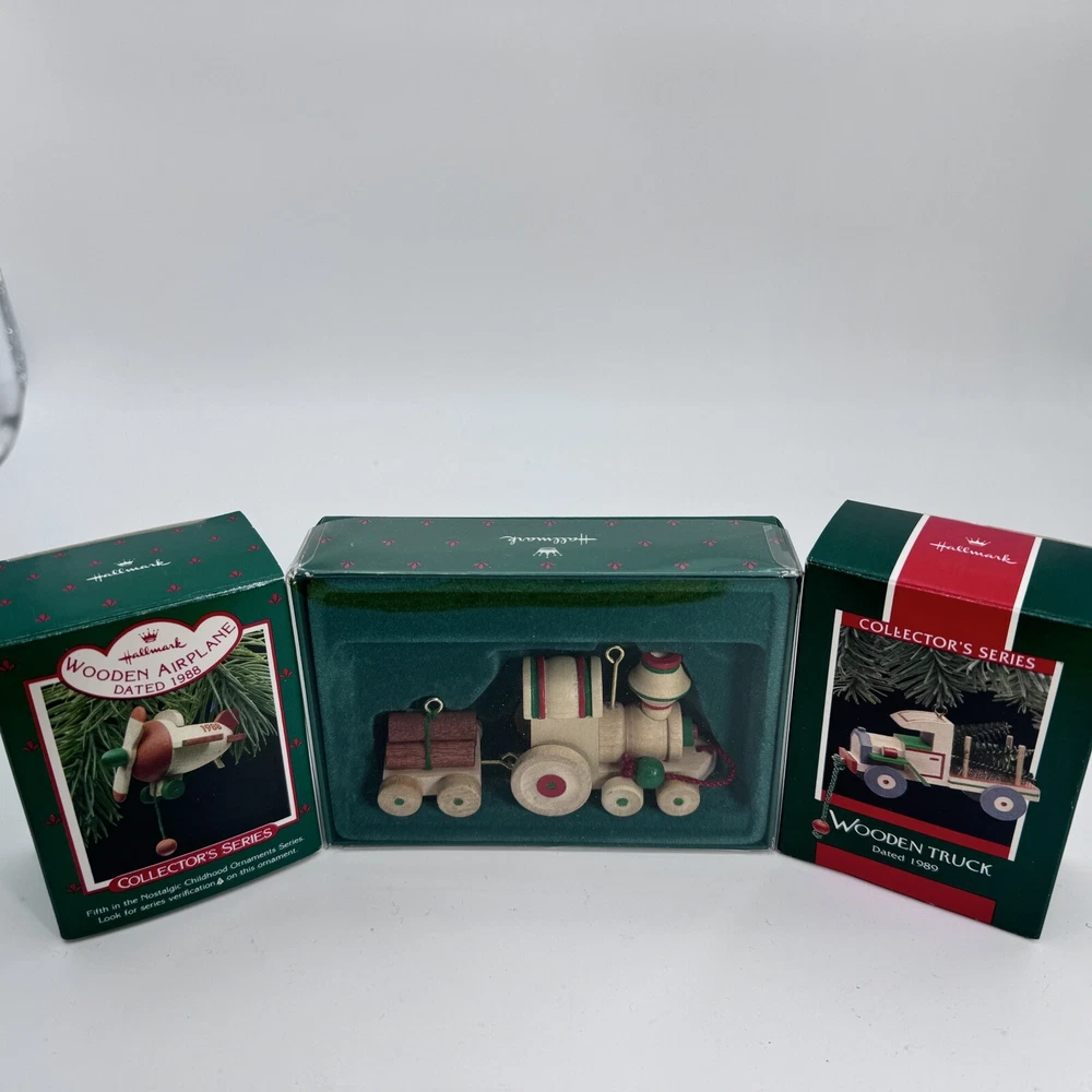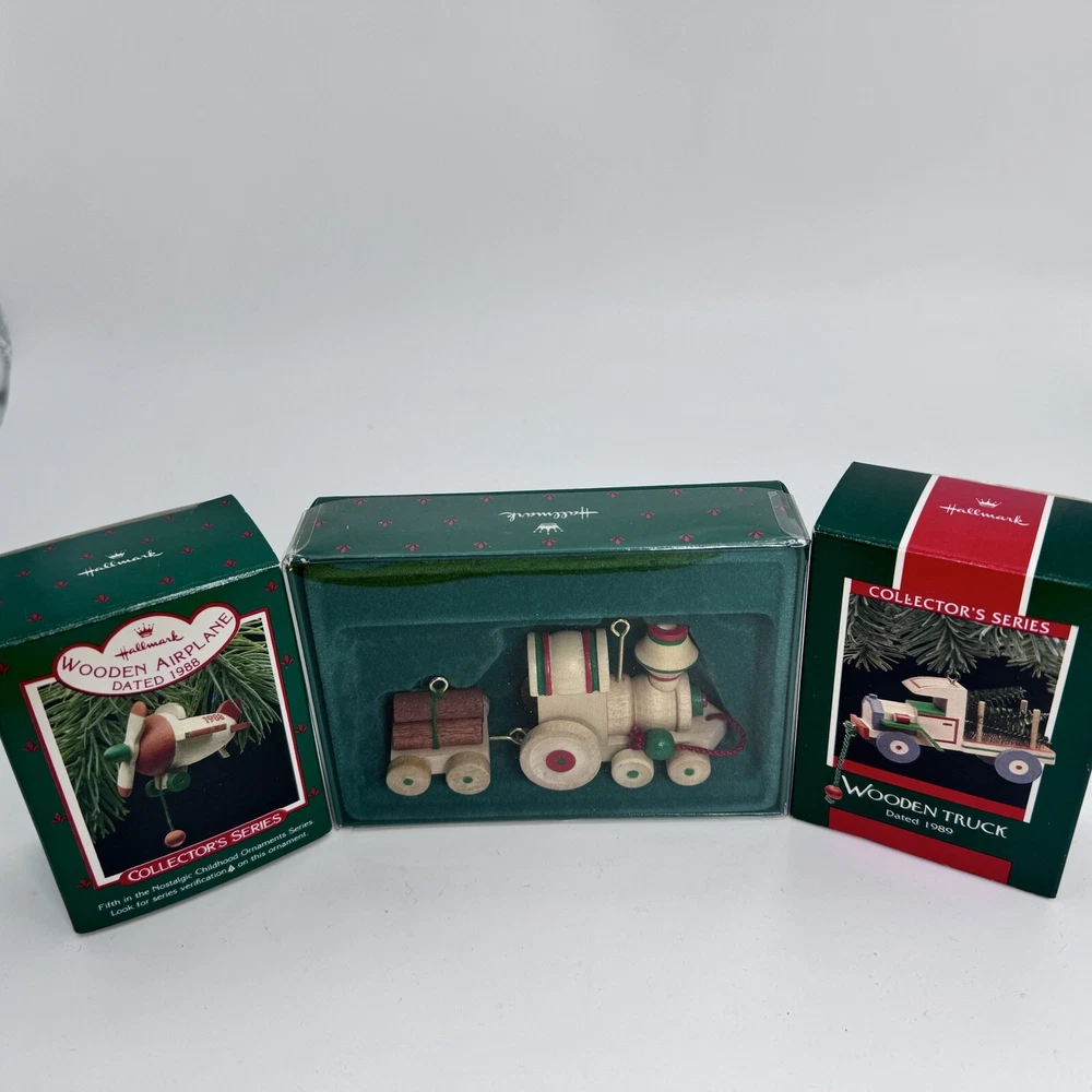 Crafted with care, this Hallmark Wooden Train Truck Plane Pull Toy Ornament lot harks back to the whimsical era of the 1980s. With a classic wood style that evokes the nostalgia of childhood, these pieces are not just ornaments but a vintage collection that celebrates the joy of transportation themes.