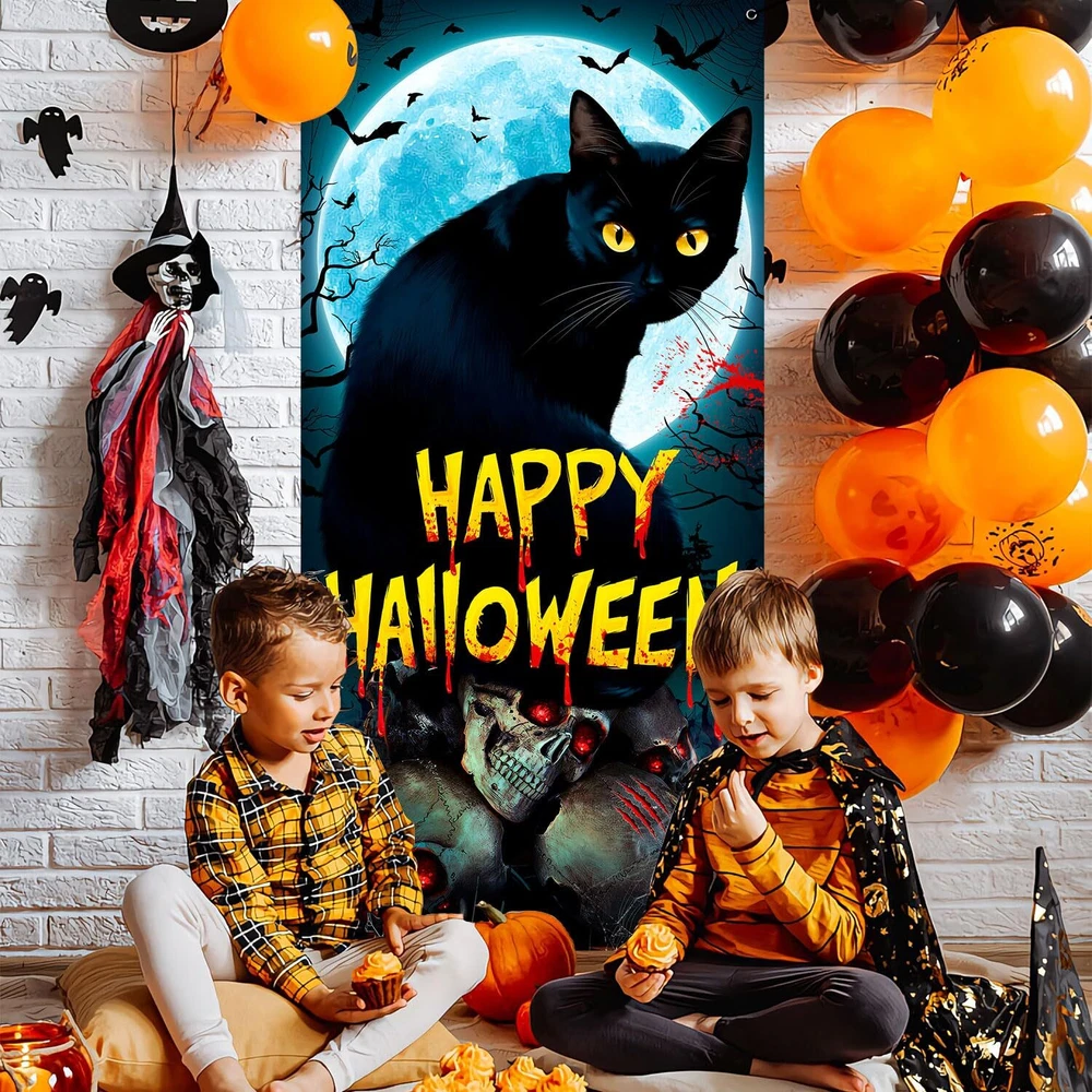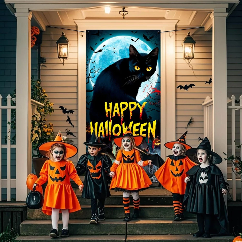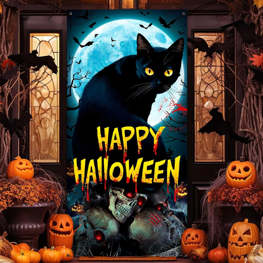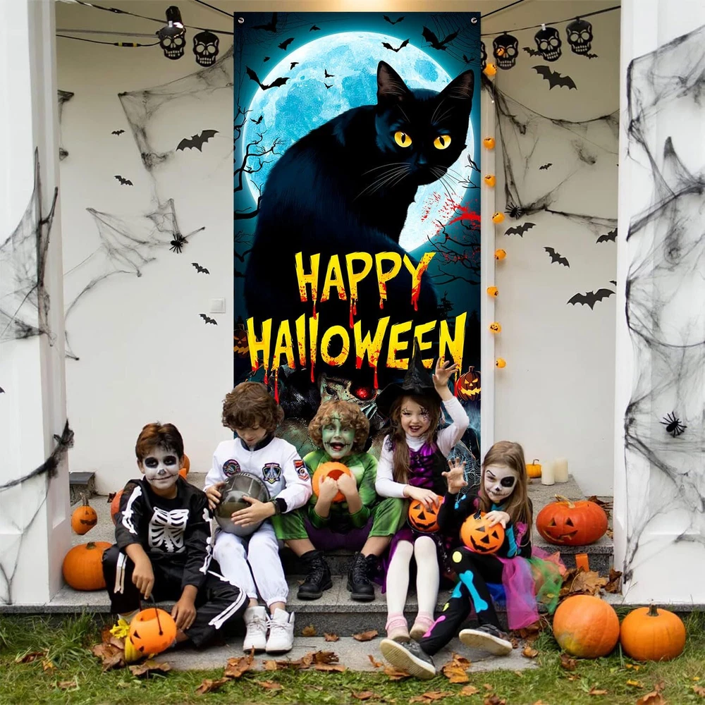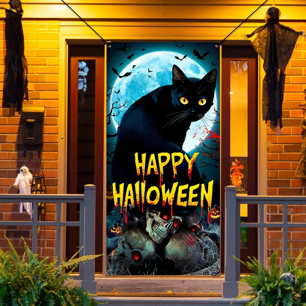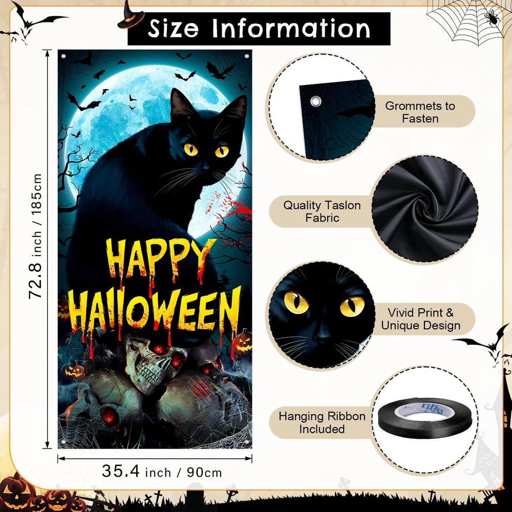 Eye-catching Halloween Decorations Unleash your spooky side this Halloween with our Halloween black cat door cover! This eye-catching decoration will transform your front door into a hauntingly beautiful display. Featuring a menacing black cat silhouette against a full moon backdrop, with a skull motif adding an extra touch of eerie charm. Specifications Material: quality fabric Color: as pictures show Size: approx. 72.8 x 35.4 inches/ 185 x 90 cm Package includes: a Halloween door cover and a black rope. An exquisite and tasteful design. Made of lightweight polyester material. Suitable size door cover for worth buying. The colors are easy to match with home decorations. Comes with a rope, easy to hang. Multiple Applications Our Halloween door cover can be used indoors and outdoors. You can apply it everywhere such as Front door, doorways halls, windows, wall, living room, bedroom, kitchen, office, porch, garden. It is perfect for your house decor and easy to create strong holiday atmosphere. Or using as a photo backdrop to take pictures with families and friends. Spooky Design: This Halloween door cover features a black cat, full moon, and skull design to create a spooky atmosphere. Embrace the spirit of the season and let your doorway become a spooktacular sight to behold! Reliable Material: This door cover is made of quality polyester fabric, which is durable and sturdy, lightweight and not easy to fade, wear and shrink resistant even through multiple washes; The polyester material touches soft and smooth, It is washable and reusable, an impressive party decoration for home, office or room. Suitable Size: The size of the black cat door cover measures approx. 72.8 x 35.4 inches/ 185 x 90 cm, and the black rope measures approx. 33 feet/ 10 meter, It is large enough to hang on the door, it's sure to make a bold statement and capture the attention of trick-or-treaters and passersby alike. Easy to Assemble: Each corner of the Halloween door cover has 4 brass holes, simply thread the equipped ribbon (cut the ribbon into 4 pieces) through the holes and tie a knot, then hang it on the hook, easy to operate, and not easy to fall off or loose. Wide Application: Whether you're hosting a Halloween party or simply want to add some festive flair to your home, this door cover is the perfect addition. Suitable for indoor and outdoor decorations, also can be hung at front door, wall, halls, windows, porch, gardens, living room, bedroom, kitchen, this eye-catching decoration will transform your front door into a hauntingly beautiful display.
