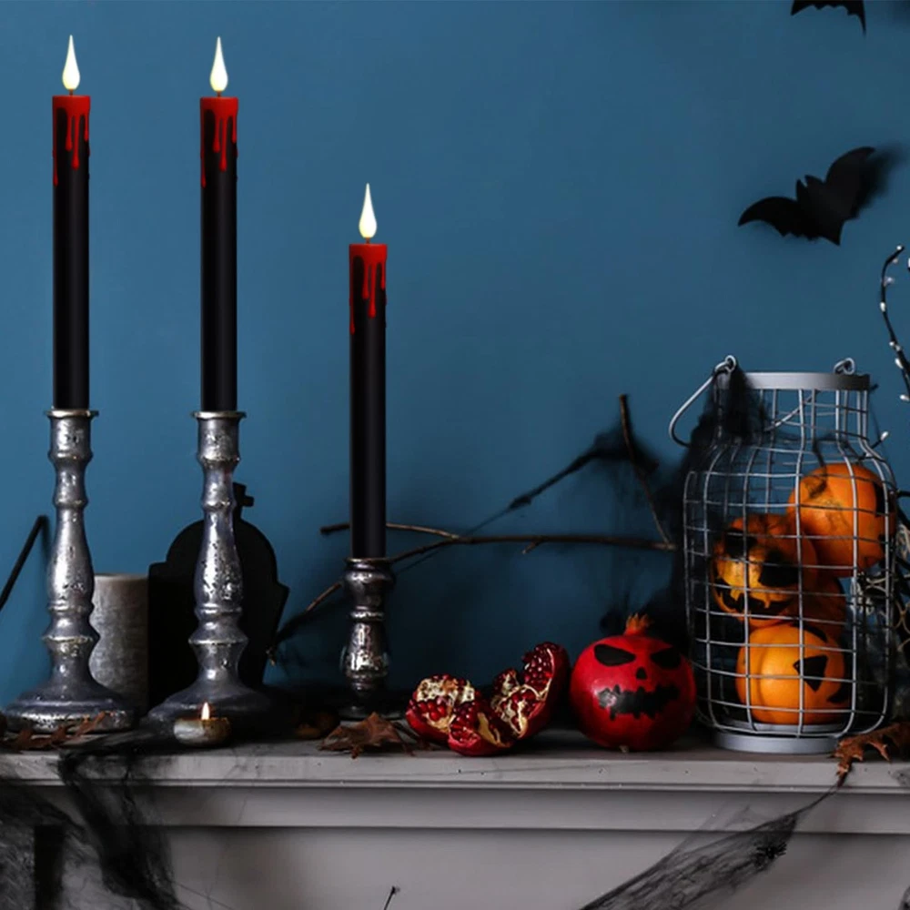 Halloween Black Flameless Taper Candles Flickering with Remote Timer, Battery Operated Led Taper Candle, 4 Pcs Drip Wax Candlesticks for Halloween Decor Horror Party Table Window Decoration Spooky Aesthetic: The 4PCS Flameless taper candles are designed with a black exterior and realistic effect, creating an eerie and gothic ambiance perfect for Halloween decor and horror-themed parties Flameless and Safe: These LED taper candles provide a flickering flame effect without the risk of real fire, making them a safe alternative to traditional candles, especially around children and pets Remote Controlled: Each set includes a remote control, allowing you to easily turn the candles on and off, adjust the brightness, and set timers from a distance, adding convenience and enhancing the spooky atmosphere with minimal effort Battery Operated: Each candle is powered by 2 AA batteries, these Halloween candles are easy to set up anywhere without worrying about electrical outlets or cords, making them ideal for window decorations, table settings, and other creative displays Versatile Decoration: The versatile design of these black LED taper candles makes them suitable for various settings, including Halloween decorations, horror parties, and as striking table or window decor, adding a hauntingly elegant touch to any scene