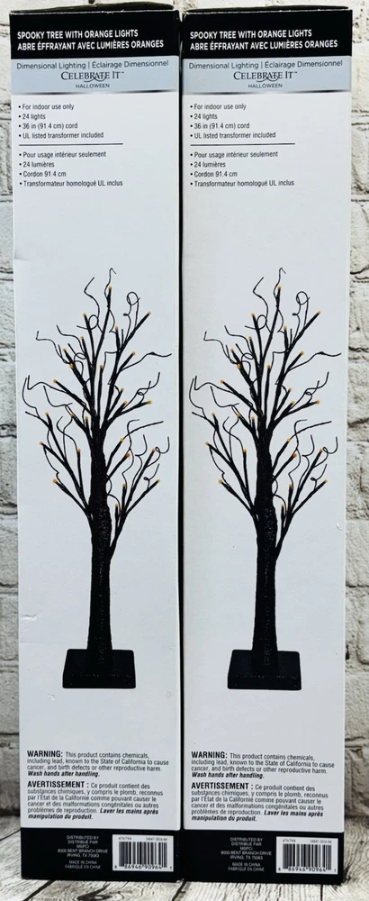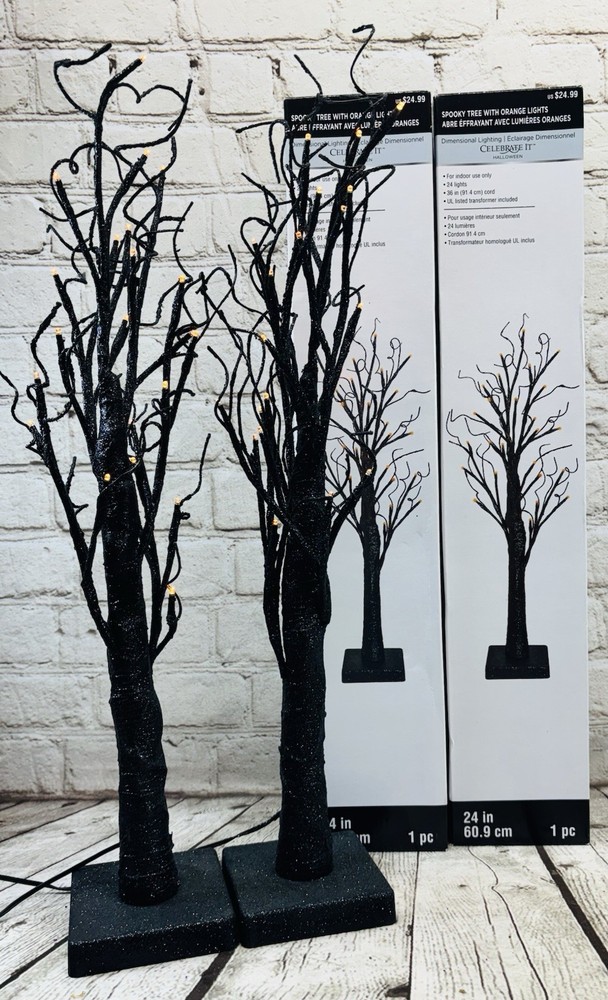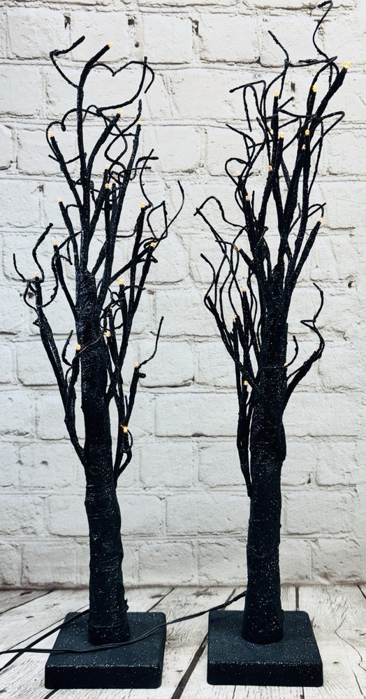Halloween Black Spooky Trees Set of 2 Light Up 24” Celebrate It Orange Lights Bring eerie ambiance to your Halloween décor with this set of two light-up spooky trees from Celebrate It. Each tree stands 24 inches tall with black glittered branches tipped with glowing orange lights. The bendable, posable branches let you shape them to your liking, making them perfect for tabletops, entryways, or haunted displays. •Brand: Celebrate It Halloween •Set includes: 2 spooky black trees •Height: 24 inches each (60.9 cm) •Lights: 24 orange lights per tree •Branches: Bendable and posable •Cord: 36 inches (91.4 cm) with UL-listed transformer •Condition: Boxes show wear; trees appear new or mint condition •Use: Indoor only A glowing Halloween decoration set that adds just the right spooky touch. Ships securely with care.