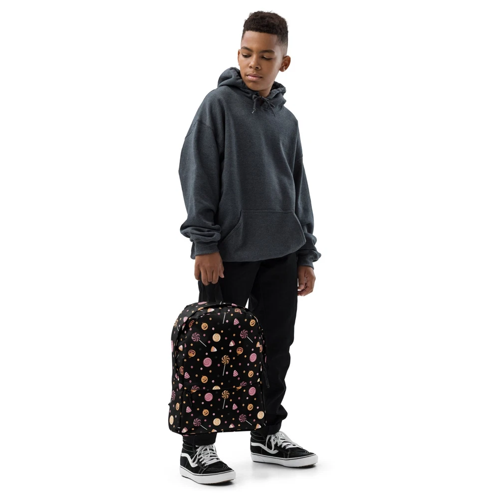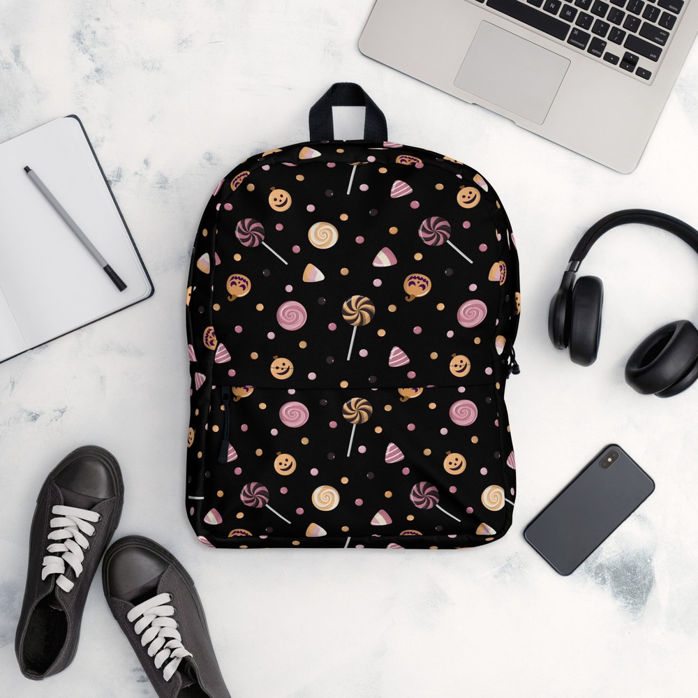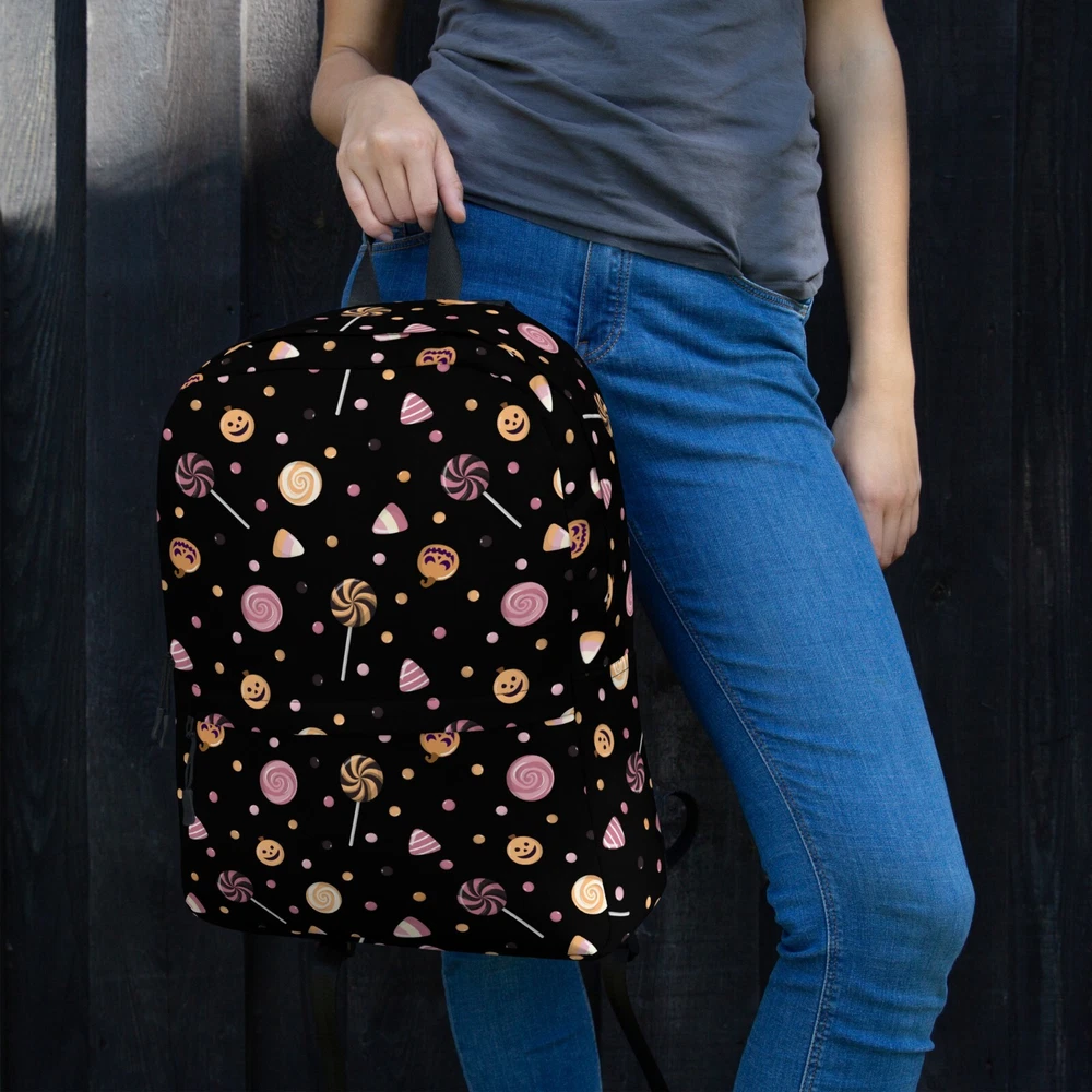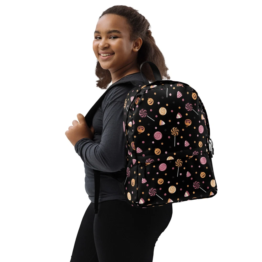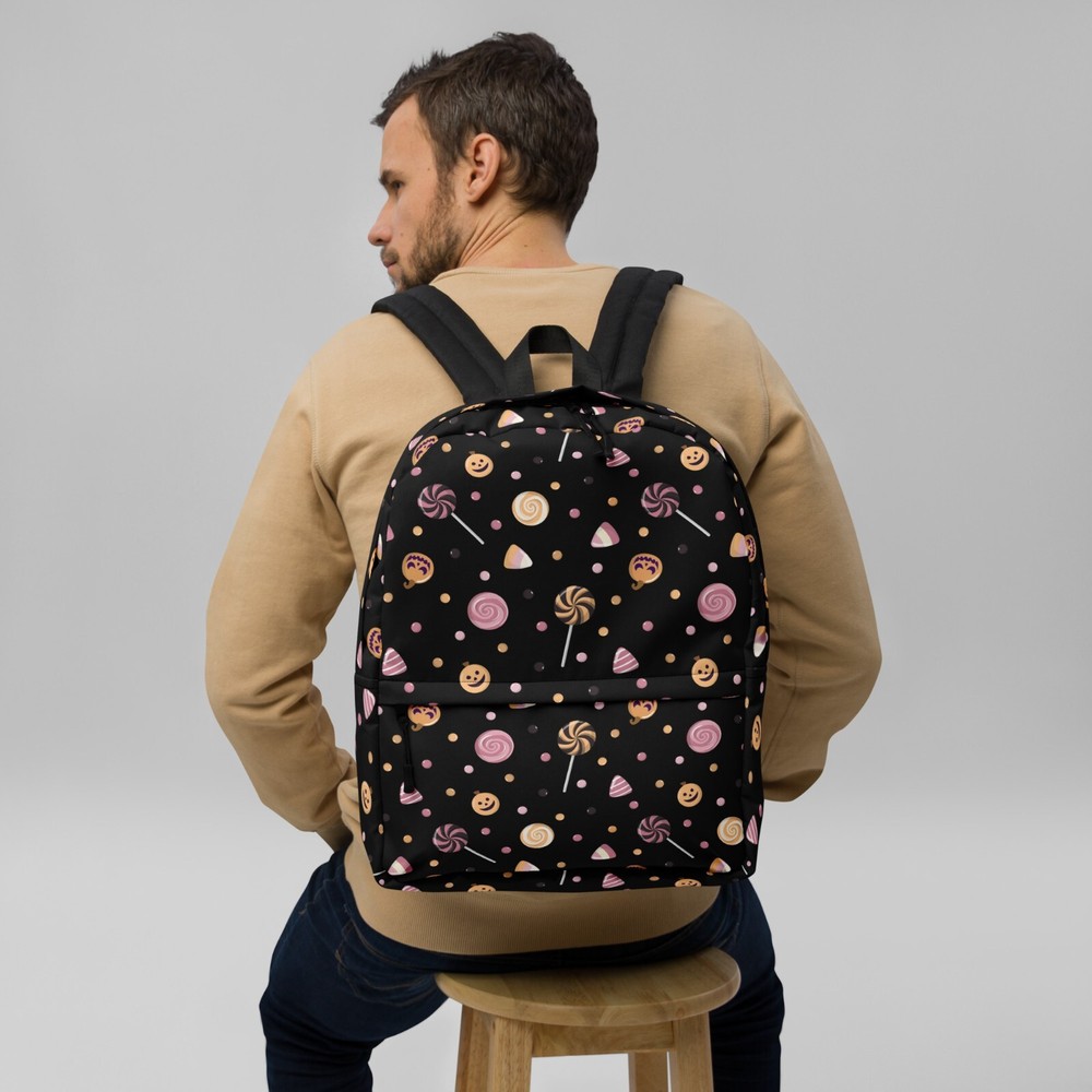 This medium size backpack with a colorful Halloween candies print with a black background is just what you need for daily use or sports activities during fall! The pockets (including one for your laptop) give plenty of room for all your necessities, while the water-resistant material will protect them from the weather. • Made from 100% polyester • Dimensions: H 16⅞" (42cm), W 12¼" (31cm), D 3⅞" (10cm) • Fabrig weight: 9 oz./yd.² (305 g/m²) • Maximum weight limit: 44lbs (20kg) • Water-resistant material • Large inside pocket with a separate compartment for a 15” laptop, front pocket with a zipper, and a hidden pocket with zipper on the back of the bag • Top zipper has 2 sliders with zipper pullers • Silky lining, piped inside hems, and a soft mesh back • Padded ergonomic bag straps from polyester with plastic strap regulators • Blank product components sourced from China This product is made especially for you as soon as you place an order, which is why it takes us a bit longer to deliver it to you. Making products on demand instead of in bulk helps reduce overproduction, so thank you for making thoughtful purchasing decisions! NOTE: Please keep in mind that colors can sometimes appear slightly different due to variations in screen resolutions and device settings.