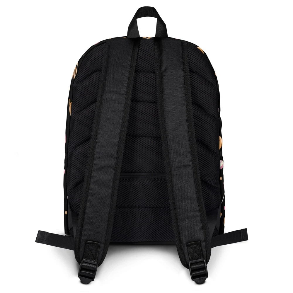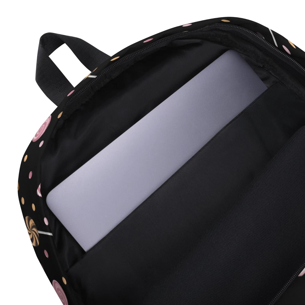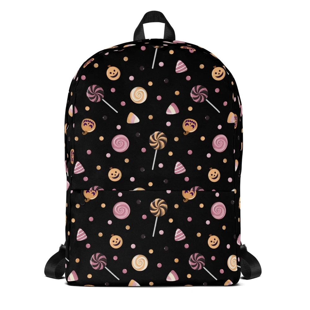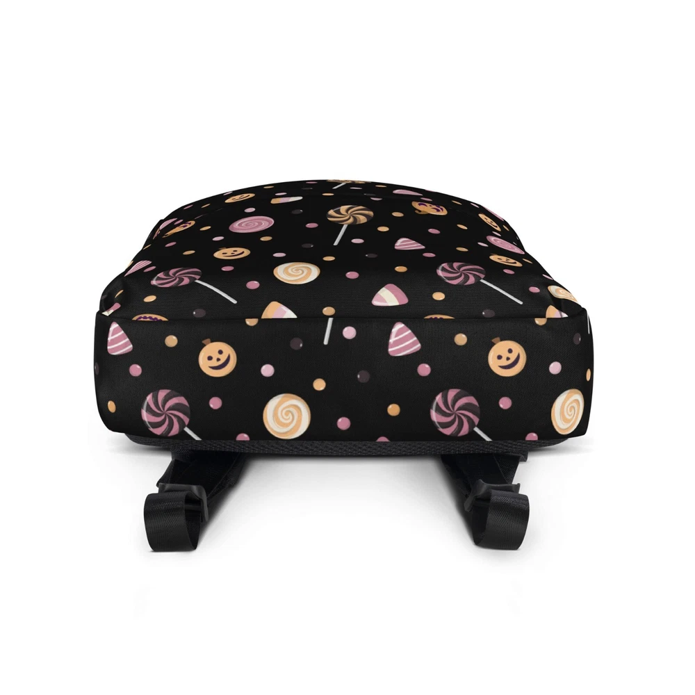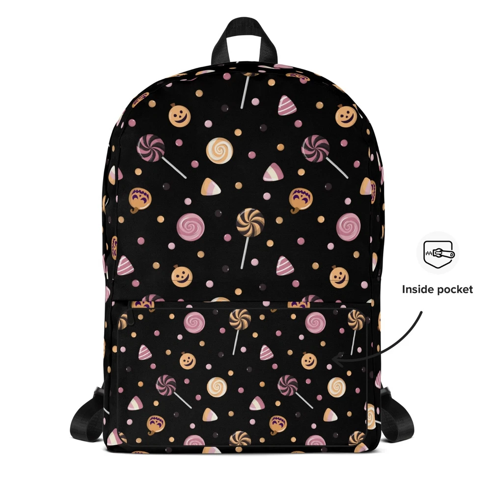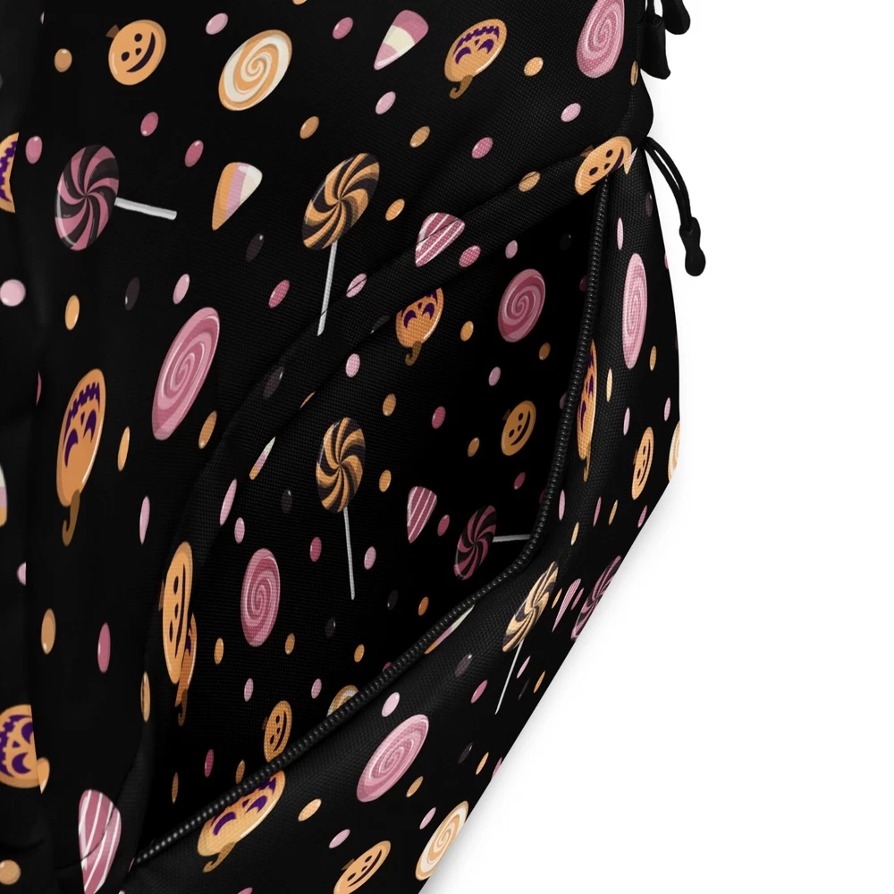 This medium size backpack with a colorful Halloween candies print with a black background is just what you need for daily use or sports activities during fall! The pockets (including one for your laptop) give plenty of room for all your necessities, while the water-resistant material will protect them from the weather. • Made from 100% polyester • Dimensions: H 16⅞" (42cm), W 12¼" (31cm), D 3⅞" (10cm) • Fabrig weight: 9 oz./yd.² (305 g/m²) • Maximum weight limit: 44lbs (20kg) • Water-resistant material • Large inside pocket with a separate compartment for a 15” laptop, front pocket with a zipper, and a hidden pocket with zipper on the back of the bag • Top zipper has 2 sliders with zipper pullers • Silky lining, piped inside hems, and a soft mesh back • Padded ergonomic bag straps from polyester with plastic strap regulators • Blank product components sourced from China This product is made especially for you as soon as you place an order, which is why it takes us a bit longer to deliver it to you. Making products on demand instead of in bulk helps reduce overproduction, so thank you for making thoughtful purchasing decisions! NOTE: Please keep in mind that colors can sometimes appear slightly different due to variations in screen resolutions and device settings.