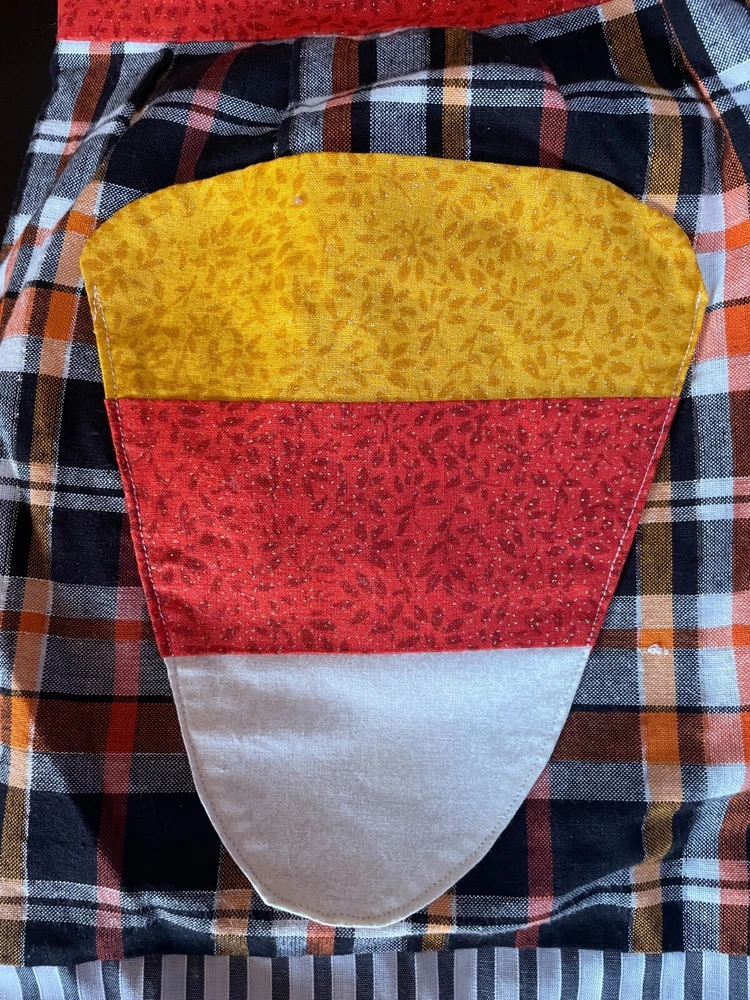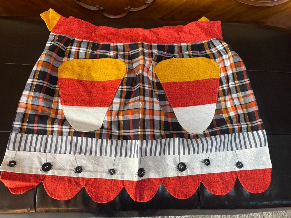 Brand new. Two pockets in the style of candy corn and button spiders along the bottom. Front waist measurement is 18.5” without ties, 78.5” tie end to tie end. Length measures 18” waist to scallop end.