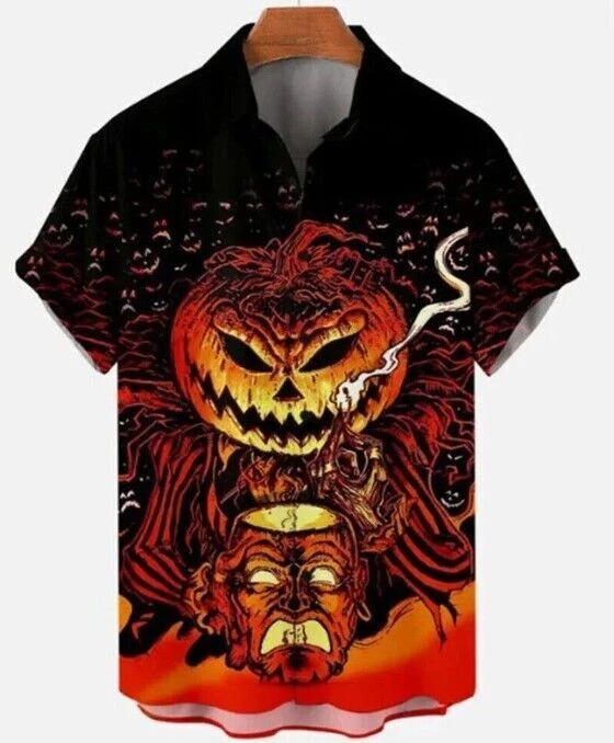 Halloween Creepy Pumpkin Pattern 3D Print Hawaiian Buttoned Shirt Lapel Top